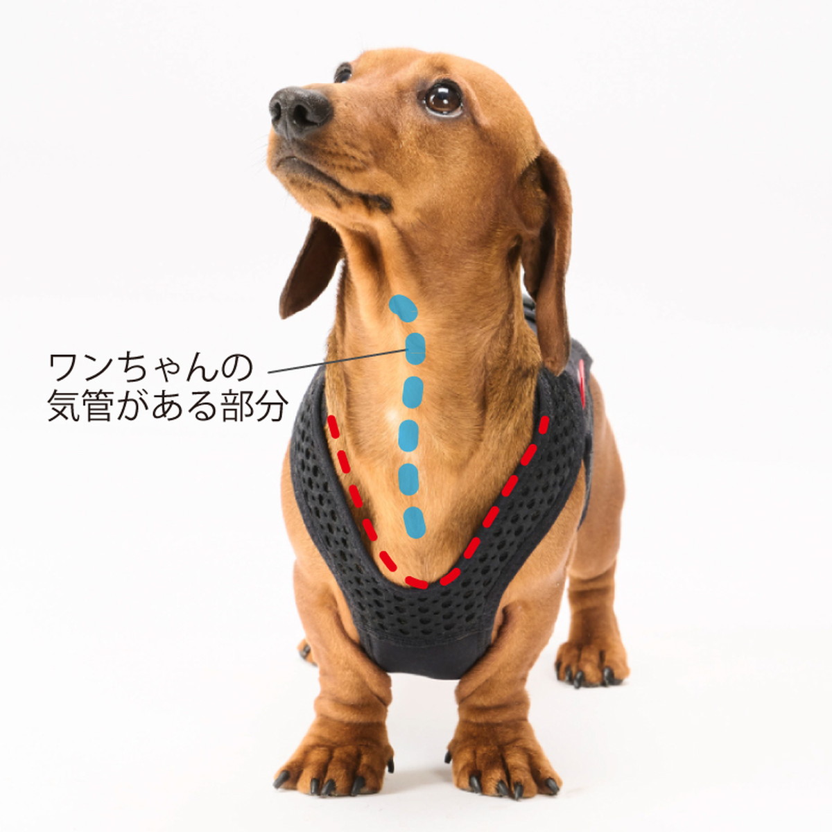 もしコルセットが後方へズレたとしても愛犬の気管にあたる部分が圧迫されないような構造となっております。