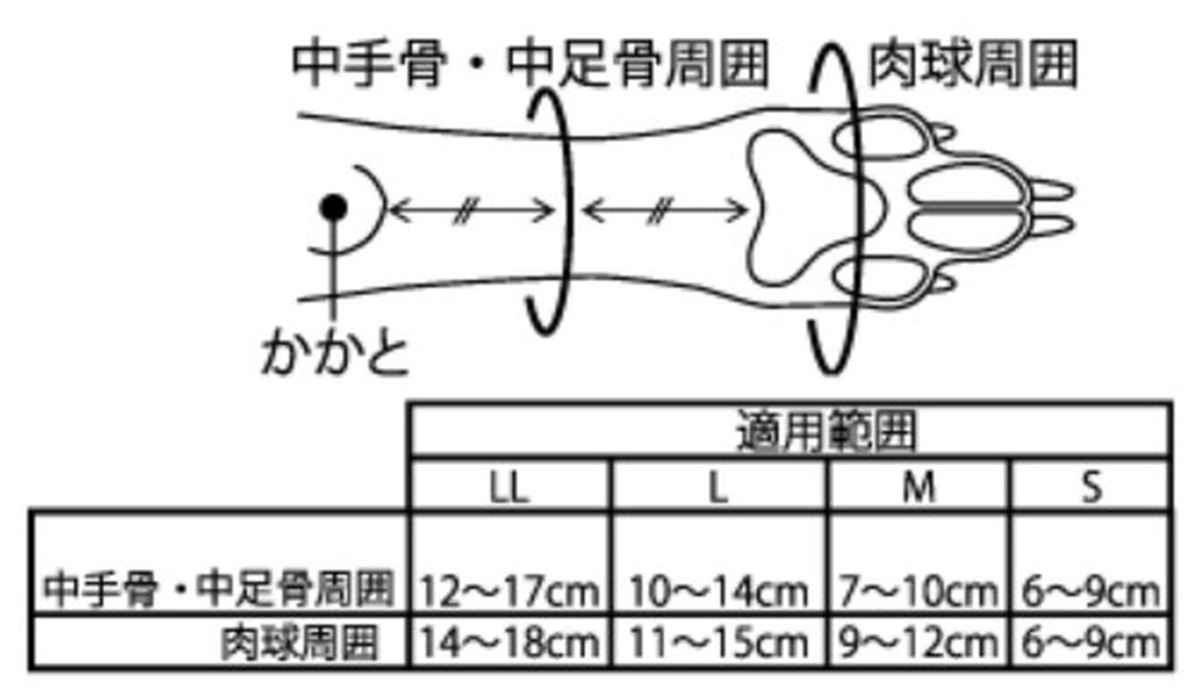 本製品は、中手骨・中足骨周囲を幅広い範囲に面ファスナーが付くような構造に設計しております。 測定した数値でサイズをまたいだ場合は、肉球周囲を目安にサイズをお選びください。