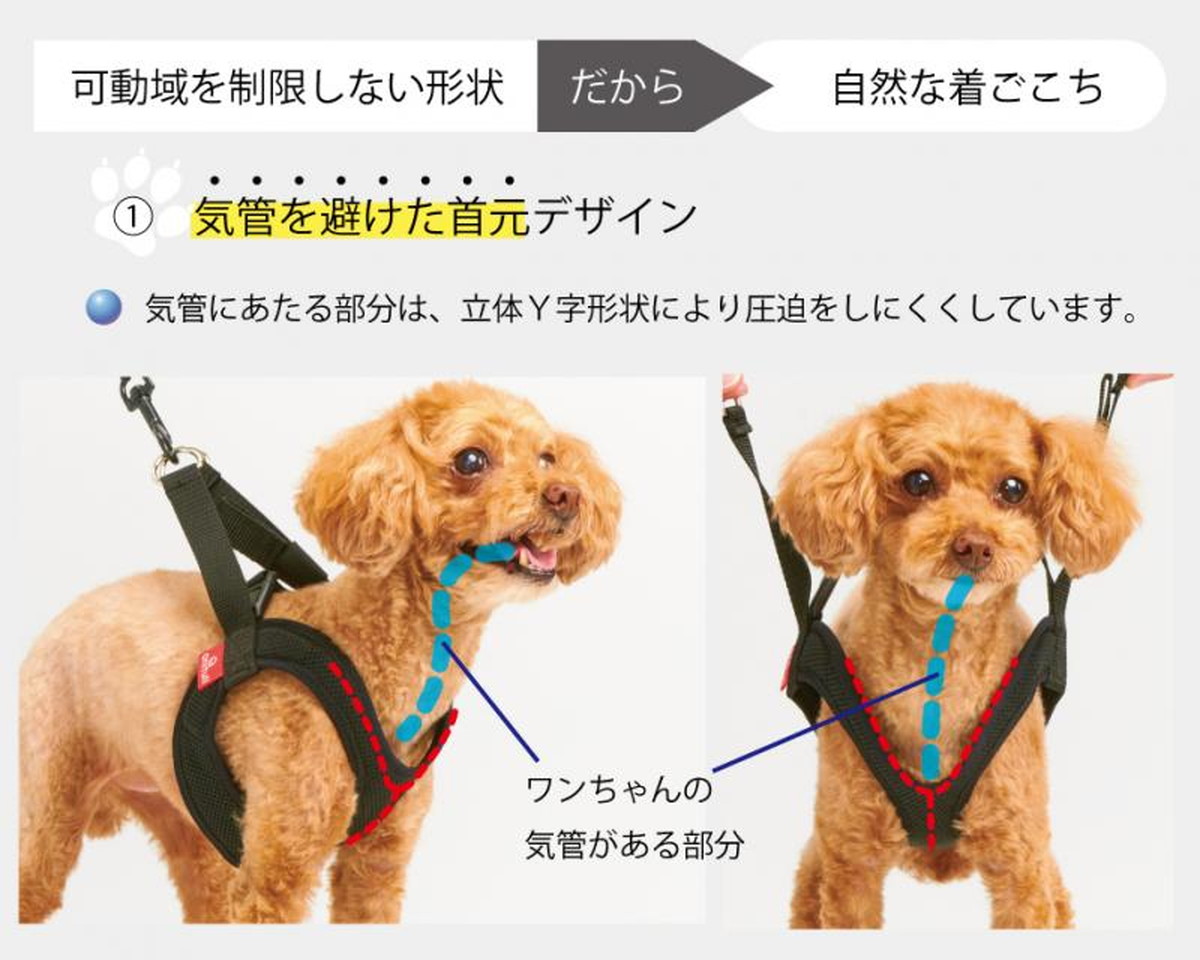 気管を避けた首元デザイン 愛犬の気管にあたる部分が圧迫されないよう、立体Y字形状のハーネスになっています。 また、首の後ろも締め付けない構造となっており、首や前脚の動作を妨げません。 愛犬の気管にやさしく、「歩く・走る」等の動作がしやすいデザインになっています。