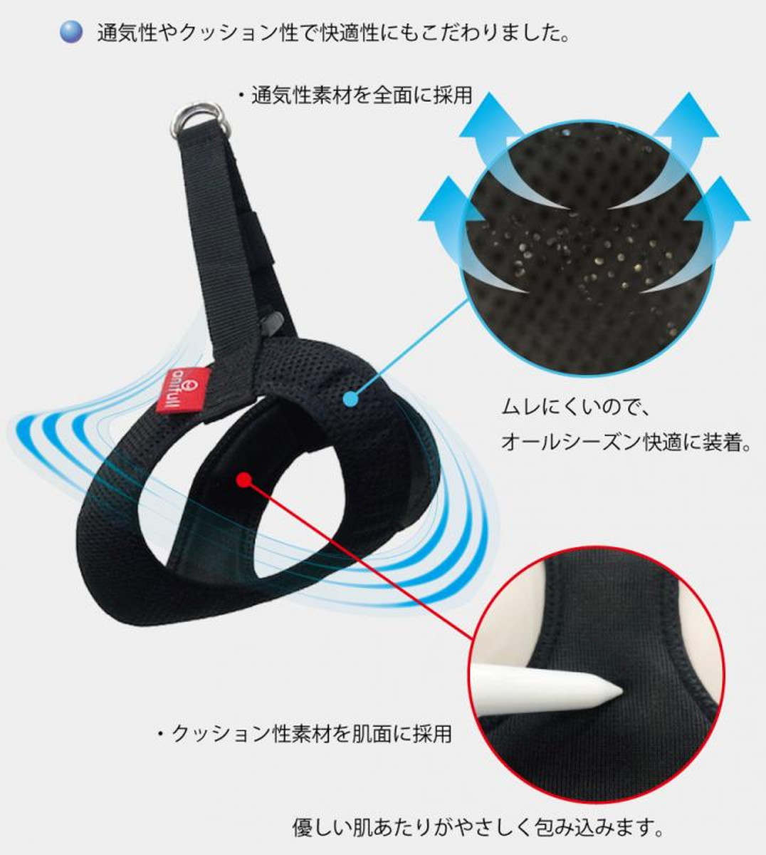 軽くて涼しい、快適素材 ハーネスは薄くて軽い計量設計で、着け心地軽やか。 (本体の厚みは約3mm、重さはMサイズで約40g) ムレにくい通気性素材を前面に採用しているので、オールシーズン快適に装着していただけます。 肌にあたる部分の生地はクッション性があり、優しい肌あたりです。