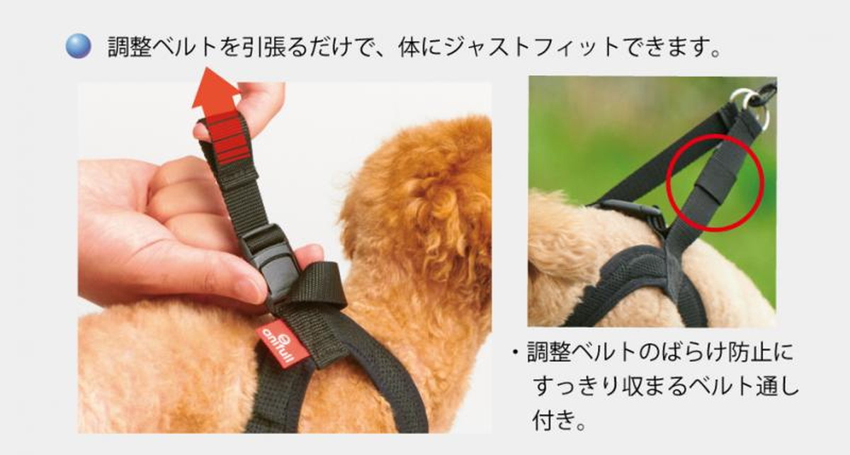 かんたん着脱で気分も快適に ハーネスの着脱は薄型のワンタッチバックルでカチッとするだけ。 音に敏感なワンちゃんにも優しい静音です。 リードにつなぐベルトの調節は、調節ベルト部分を引っ張るだけでフィットする長さに変更できます。 調節ベルトのばらけ防止に使用できるベルト通し付きです。