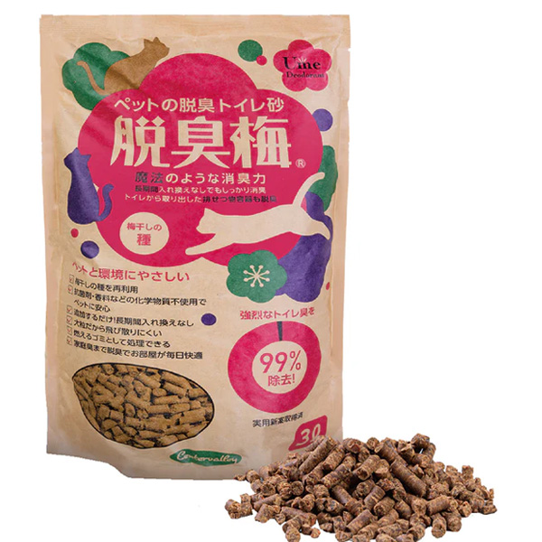 梅干しの種に驚きの消臭力!この種を使った猫砂です。普段の猫砂に混ぜて使用することで、おしっこの臭いを消臭します。また猫砂が室内の臭いも消臭するので、室内の嫌な臭いをW消臭!●梅干しの種を再利用していますので、環境にやさしい商品です。●抗菌剤・香料などの化学物質不使用でペットに安心です。●お使いの猫砂に混ぜてお使いください。長期間入れ換えなし●大粒だから飛び散りにくい。通常の砂より大きくなっています。●燃えるゴミとして処理できます。(お住いの地域の処理方法に従って処理してください。)●家庭臭まで脱臭。お部屋が毎日快適に過ごせます。