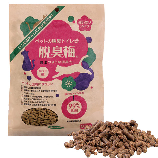 梅干しの種に驚きの消臭力!この種を使った猫砂です。普段の猫砂に混ぜて使用することで、おしっこの臭いを消臭します。また猫砂が室内の臭いも消臭するので、室内の嫌な臭いをW消臭!●梅干しの種を再利用していますので、環境にやさしい商品です。●抗菌剤・香料などの化学物質不使用でペットに安心です。●お使いの猫砂に混ぜてお使いください。長期間入れ換えなし●大粒だから飛び散りにくい。通常の砂より大きくなっています。●燃えるゴミとして処理できます。(お住いの地域の処理方法に従って処理してください。)●家庭臭まで脱臭。お部屋が毎日快適に過ごせます。