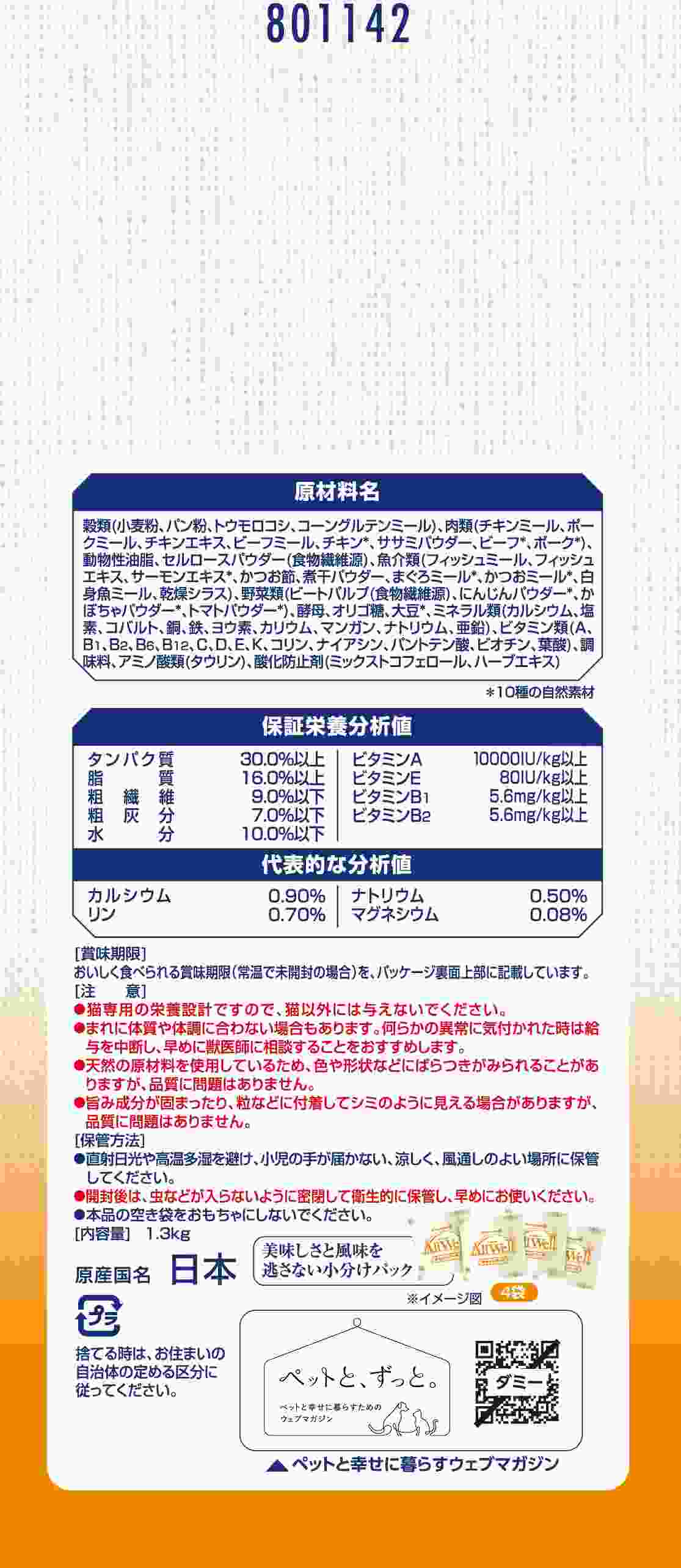 原材料穀類(小麦粉、パン粉、トウモロコシ、コーングルテンミール)、肉類(チキンミール、ポークミール、チキンエキス、ビーフミール、チキン*、ササミパウダー、ビーフ*、ポーク*)、動物性油脂、セルロースパウダー(食物繊維源)、魚介類(フィッシュミール、フィッシュエキス、サーモンエキス*、かつお節、煮干パウダー、まぐろミール*、かつおミール*、白身魚ミール、乾燥シラス)、野菜類(ビートパルプ(食物繊維源)、にんじんパウダー*、かぼちゃパウダー*、トマトパウダー*)、酵母、オリゴ糖、大豆*、ミネラル類(カルシウム、塩素、コバルト、銅、鉄、ヨウ素、カリウム、マンガン、ナトリウム、亜鉛)、ビタミン類(A、B1、B2、B6、B12、C、D、E、K、コリン、ナイアシン、パントテン酸、ビオチン、葉酸)、調味料、アミノ酸類(タウリン)、酸化防止剤(ミックストコフェロール、ハーブエキス)*10種の自然素材
