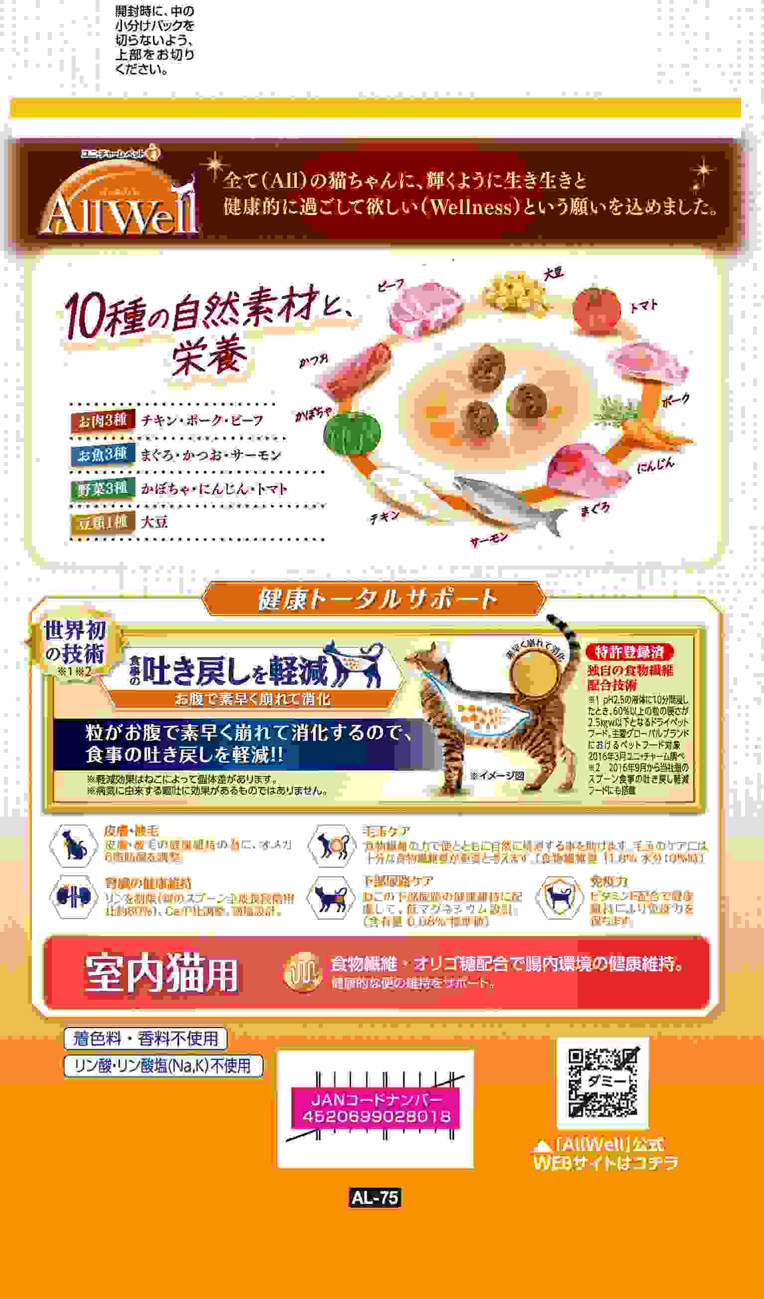 ・食事の吐き戻しを軽減し、10種の自然素材と栄養を! ・10種の自然素材 チキン・ポーク・ビーフ/まぐろ・かつお・サーモン/かぼちゃ・にんじん・トマト/大豆 配合。 ・食物繊維・オリゴ糖配合で腸内環境の健康維持。 健康的な便の維持をサポート。 ・猫が大好きなチキンの旨みが詰まった粒に、挽き小魚をまぶした高い嗜好性