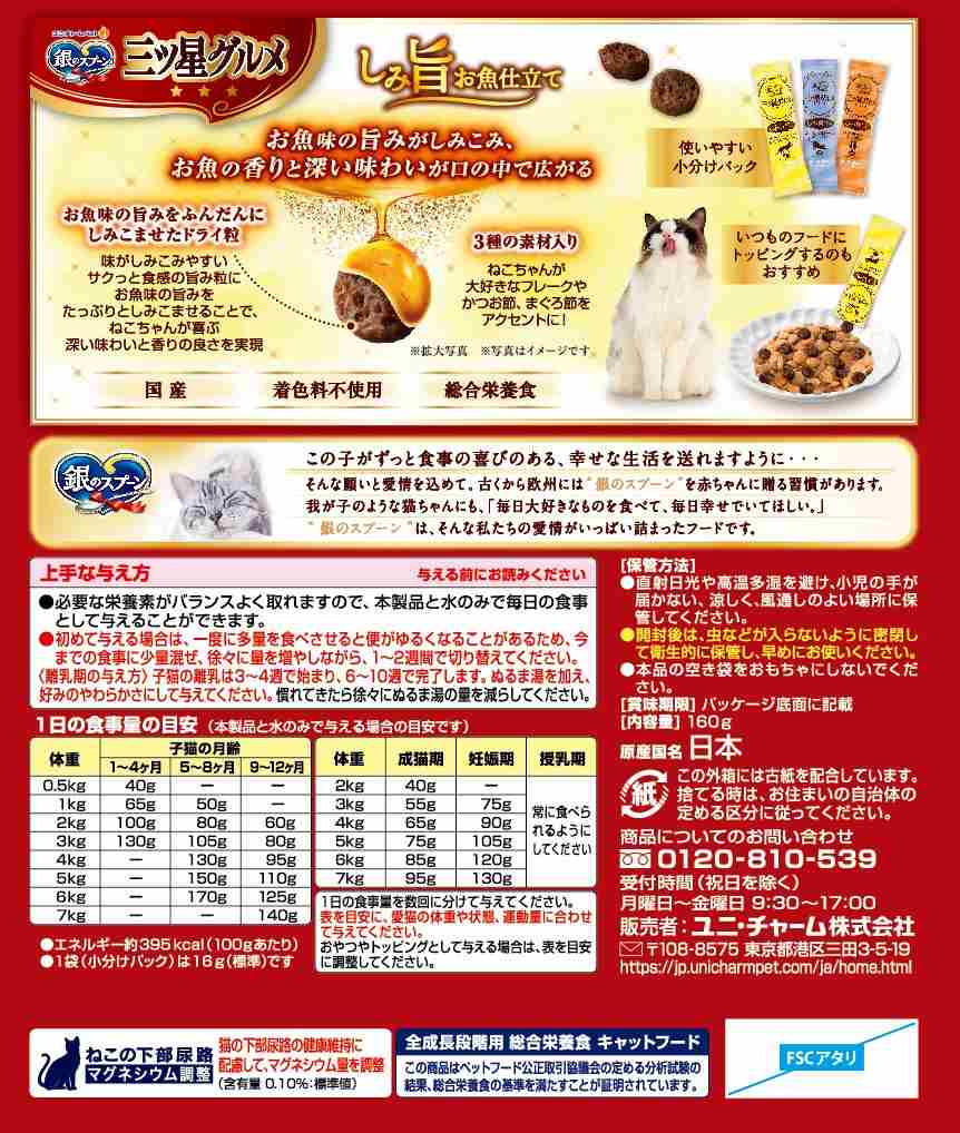 使用上の注意●猫専用の栄養設計ですので、猫以外には与えないでください。●まれに体質や体調に合わない場合もあります。何らかの異常に気付かれた時は給与を中断し、早めに獣医師に相談することをおすすめします。●天然の原材料を使用しているため、粒の色や形状、素材の大きさや数にばらつきがみられることがありますが、品質に問題はありません。血合い部分が黒く見えることがあります。●旨み成分が固まったり、粒などに付着してシミのように見える場合がありますが、品質に問題はありません。