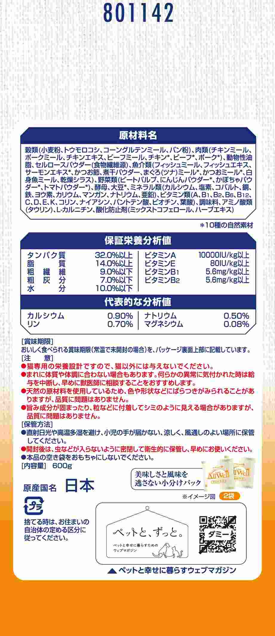 ・食事の吐き戻しを軽減し、10種の自然素材と栄養を! ・10種の自然素材 チキン・ポーク・ビーフ/まぐろ・かつお・サーモン/かぼちゃ・にんじん・トマト/大豆 配合。 ・高たんぱく設計で筋肉の健康維持(室内猫用比約105%)。L-カルニチン配合。 ・猫が大好きなサーモンとツナの旨みが詰まった粒に、挽き小魚をまぶした高い嗜好性