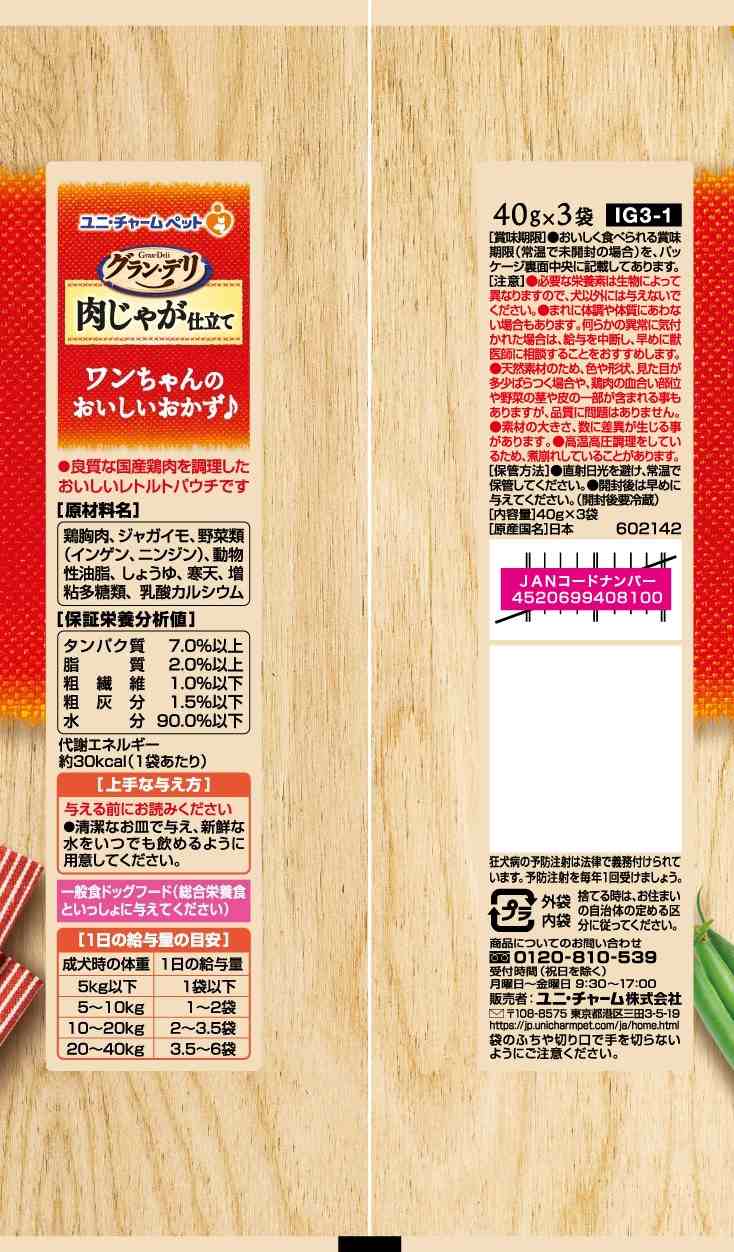 ・私もおいしそうと思う見た目のおいしさにもこだわったワンちゃん専用レトルトパウチ・ワンちゃんの大好きな肉じゃが仕立て\n・良質な100%国産鶏肉を使用・じゃがいも、にんじん、インゲンを使用