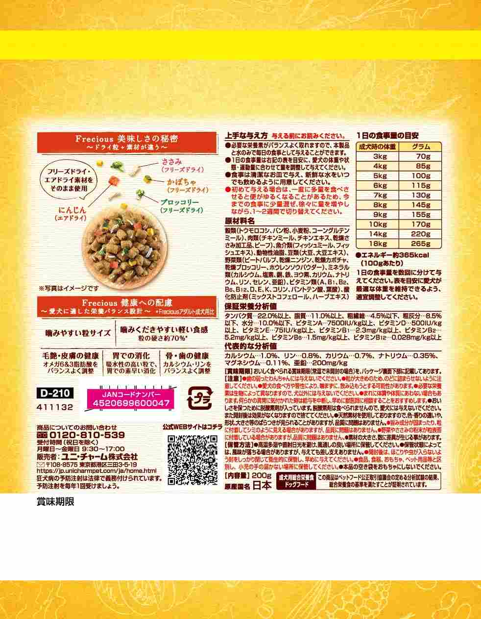 使用上の注意●歯の弱ったわんちゃんには与えないでください。●粒が大きめのため、のどに詰まらせないように注意してください。●愛犬の食べ方や習性により、噛まずに、飲み込もうとする可能性があります。●必要な栄養素は生物によって異なりますので、犬以外には与えないでください。●まれに体調や体質にあわない場合もあります。何らかの異常に気付かれた時は給与を中断し、早めに獣医師に相談することをおすすめします。●おいしさを保つために脱酸素剤が入っています。脱酸素剤は食べられませんので、愛犬には与えないでください。また開封後は効果がなくなりますので捨ててください。●天然素材を使用しておりますので、色・香りの違いや、形状、大きさ等のばらつきが見られることがありますが、品質に問題はありません。●旨み成分が固まったり、粒に付着してシミのように見える場合がありますが、品質に問題はありません。●野菜やささみの粉末が粒表面に付着している場合がありますが、品質に問題はありません。●素材の大きさ、数に差異が生じる事があります。