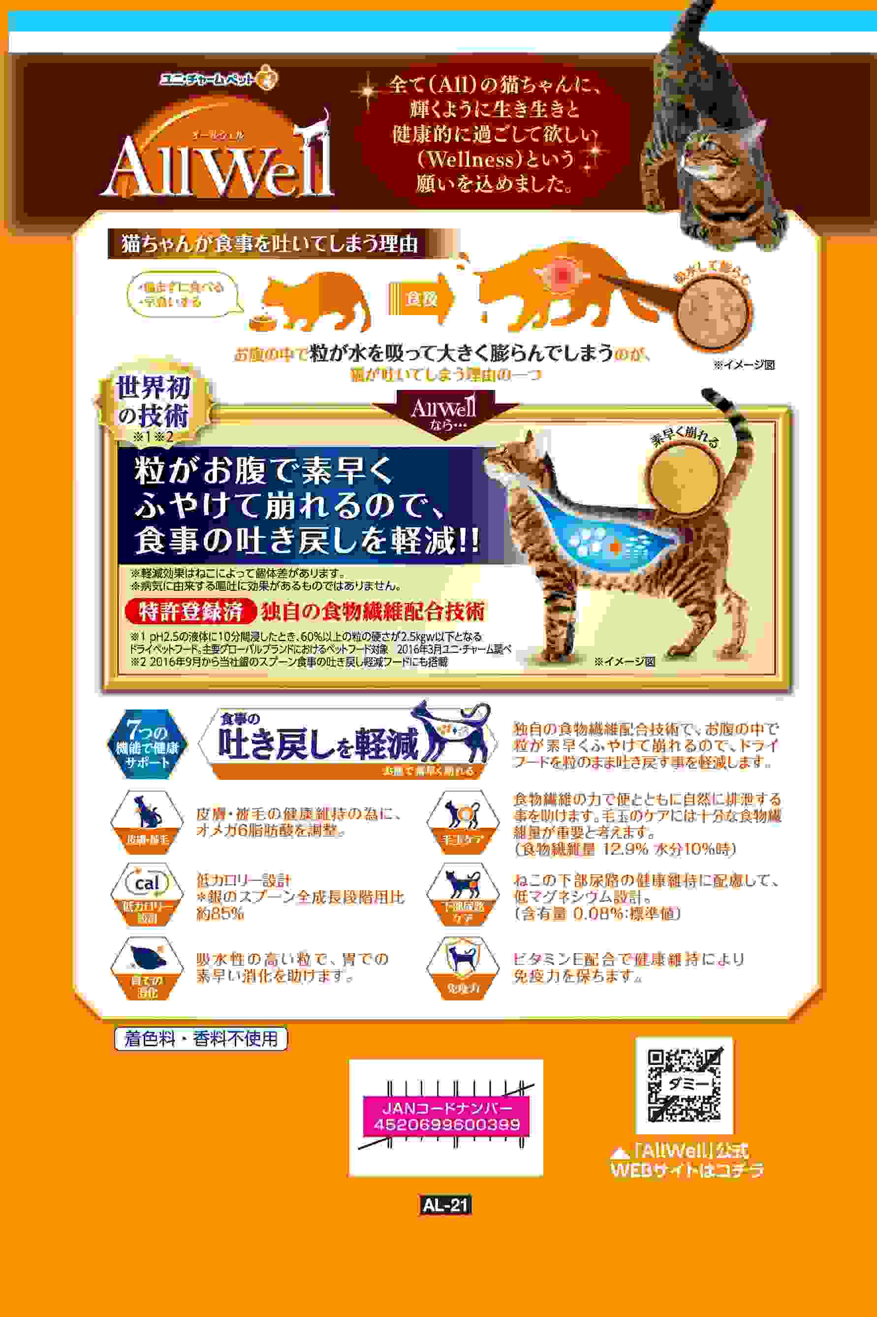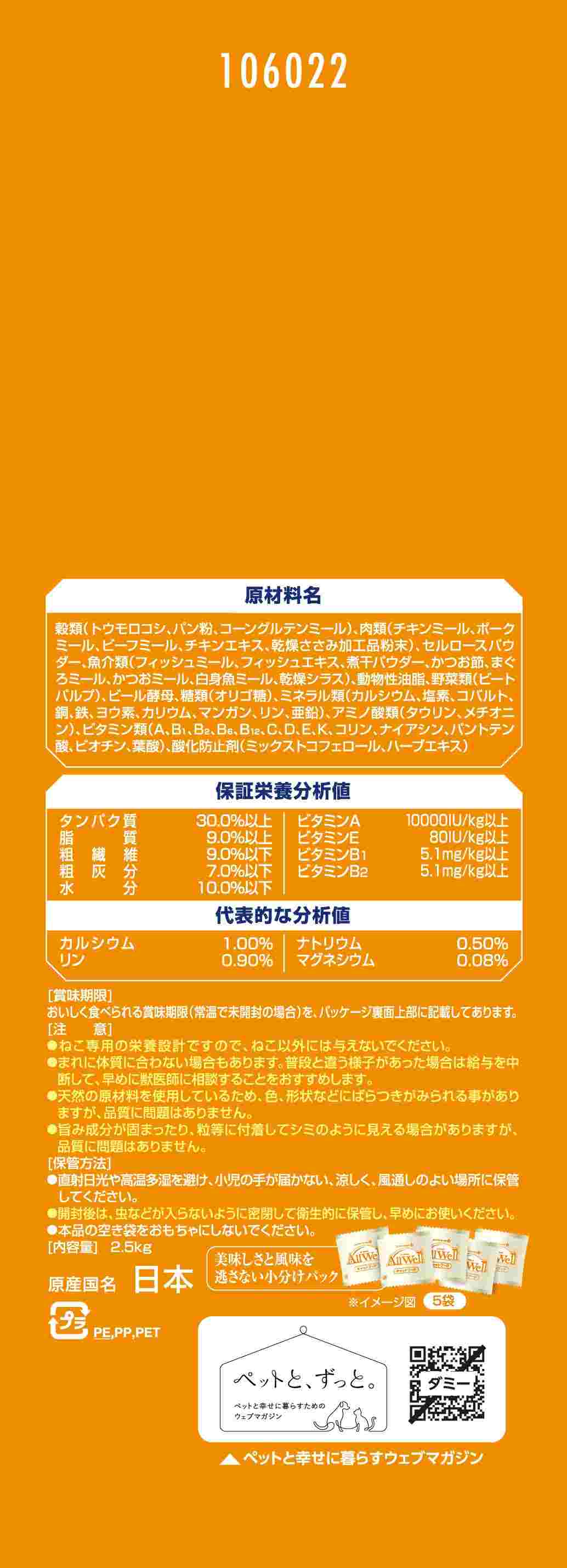 ・食事の吐き戻し軽減を中心とした7つの機能で健康サポート。 ・腸内環境に配慮して、健康的な便の維持のために、食物繊維配合。オリゴ糖配合。 ・骨の健康維持に配慮して、カルシウム・リン・ビタミンDを配合。 ・猫が大好きなフィッシュの旨みが詰まった粒に、挽き小魚と微粉砕したささみフリーズドライをまぶした高い嗜好性。 ・着色料・香料不使用。