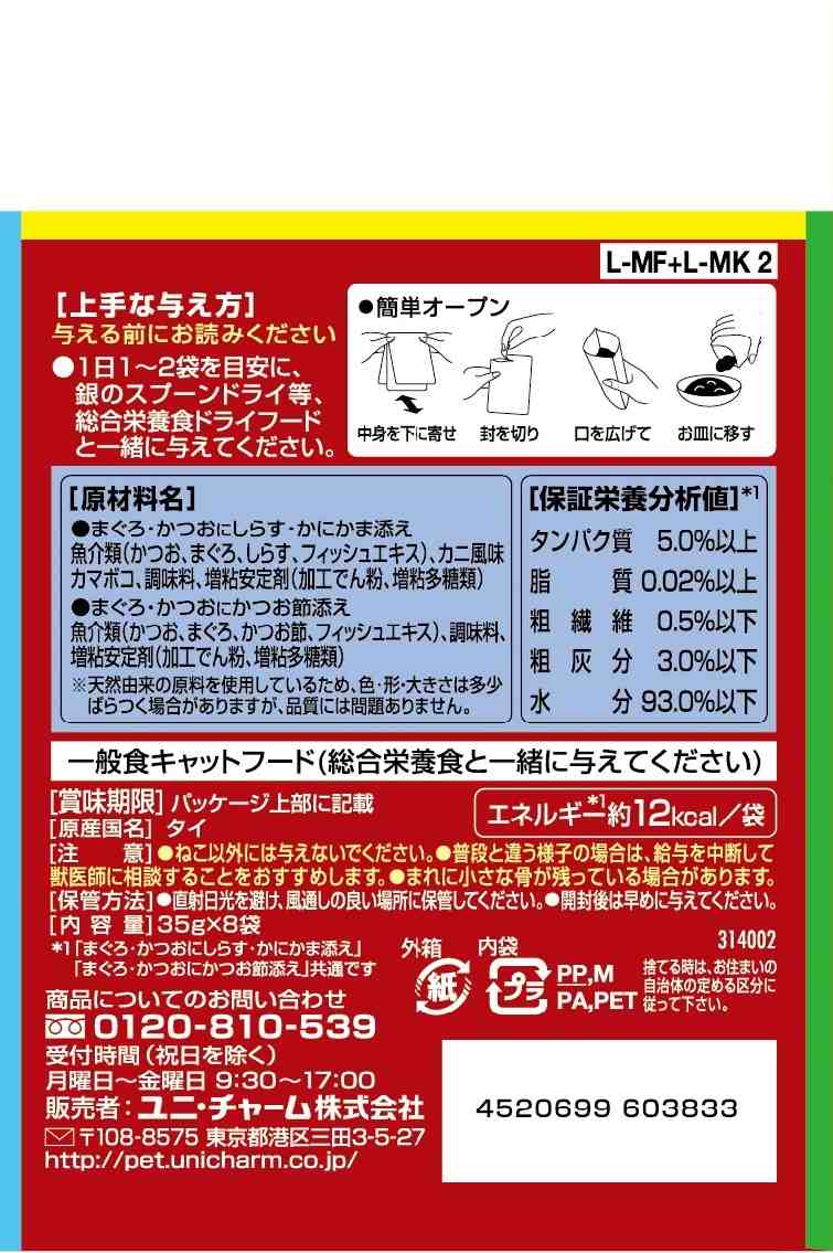 ●まぐろ・かつおにしらす・かにかま添え/魚介類(かつお、まぐろ、しらす、フィッシュエキス)、カニ風味カマボコ、調味料、増粘安定剤(加工でん粉、増粘多糖類)●まぐろ・かつおにかつお節添え/魚介類(かつお、まぐろ、かつお節、フィッシュエキス)、調味料、増粘安定剤(加工でん粉、増粘多糖類)※天然由来の原料を使用しているため、色・形・大きさは多少ばらつく場合がありますが、品質には問題ありません。