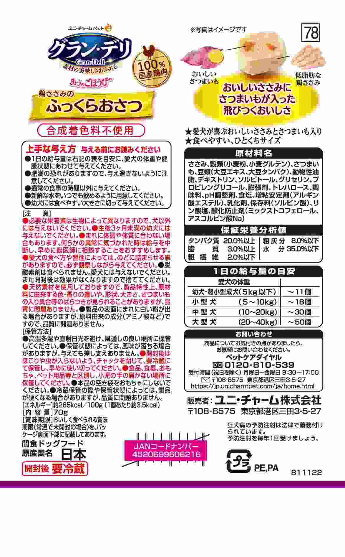 ・100%国産鶏肉を使用し、使用シーンに合わせた色々なタイプがある美味しいおやつ ・愛犬が喜ぶおいしいささみとさつまいもをたっぷり入れました ・食べやすいふっくらタイプ ・低脂肪なささみを使用 ・合成着色料不使用