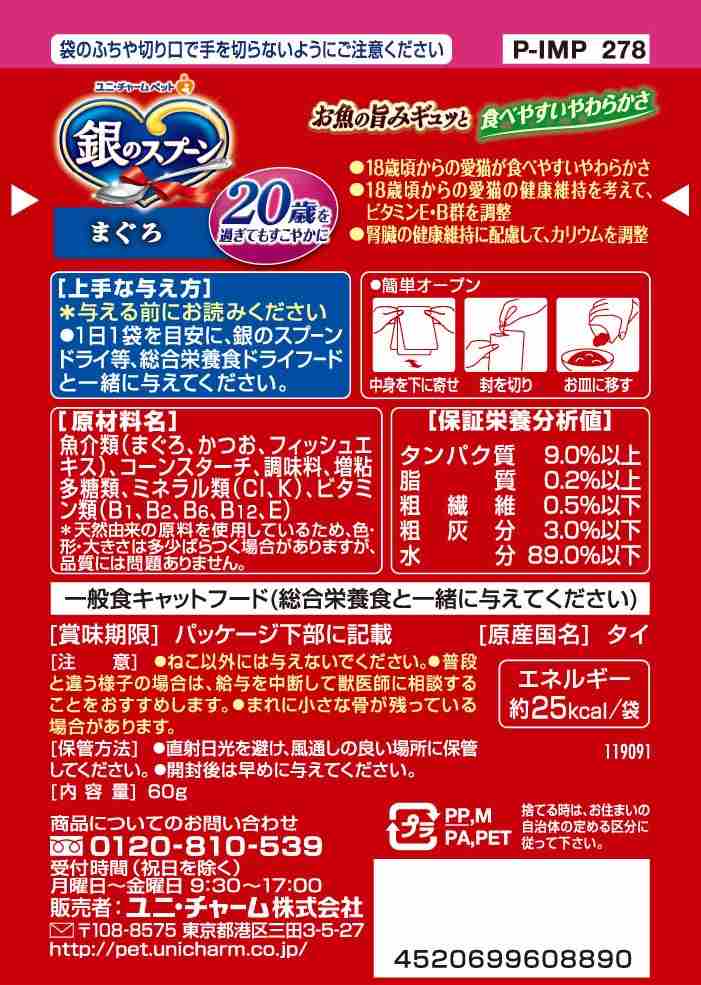 魚介類(まぐろ、かつお、フィッシュエキス)、コーンスターチ、調味料、増粘多糖類、ミネラル類(Cl、K)、ビタミン類(B1、B2、B6、B12、E)