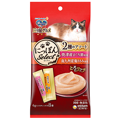 【商品の特徴】・日本各地の「お取り寄せ」素材を使用した、とろ~りウェットタイプの上質なおやつ・6gで食べきりサイズ国産無着色・焼津産まぐろ節、南九州産鶏ささみを使用