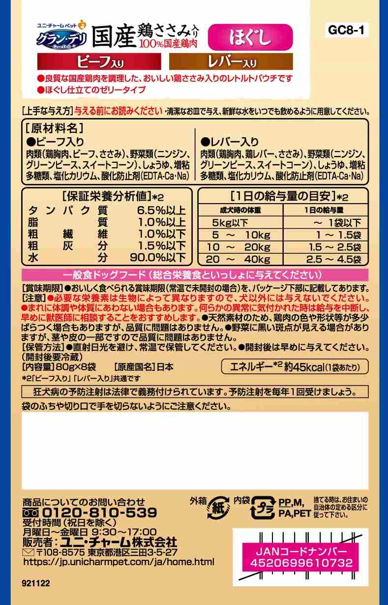 ・100%国産の良質な鶏肉を調理・美味しい鶏ささみ入りレトルトパウチ・愛犬が大好きなほぐし仕立てのゼリータイプ・ビーフ入りとレバー入りがそれぞれ4袋ずつ入った嬉しいアソート8袋パック