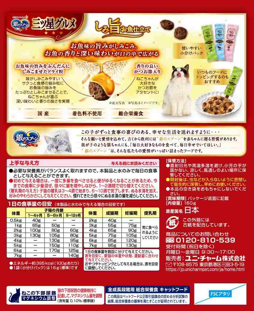 ・お魚味の旨みがしみこんで、深い味わいと香りの良さを実現 ・ネコちゃんが喜ぶかつお節入り ・3種のアソートタイプ ・着色料不使用 ・全成長段階用総合栄養食 ・ねこの下部尿路の健康維持に配慮して、マグネシウム量を調整(含有量0.10%:標準値) ・おいしさと豊かな風味を逃さない、食べきり小分けパック16g(標準)×10袋