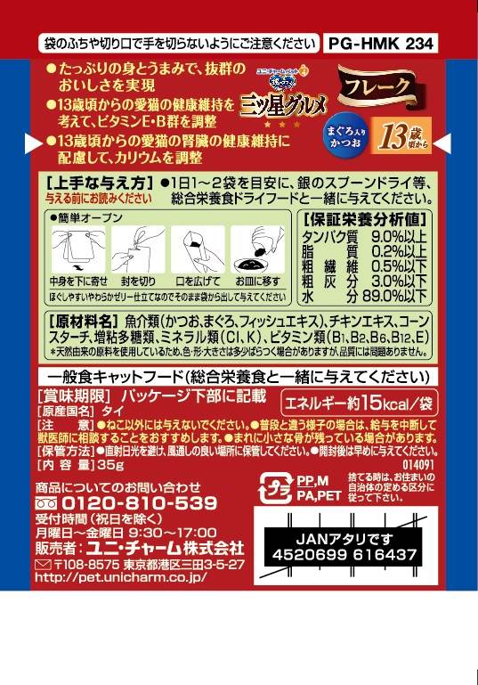 ・たっぷりの身とうまみで、抜群のおいしさを実現 ・13歳頃からの愛猫の健康維持を考えて、ビタミンE・B群を調整。 ・食べやすい小さめのフレーク・ほぐしやすいやわらかゼリー仕立て ・腎臓の健康維持に配慮して、カリウムを調整。