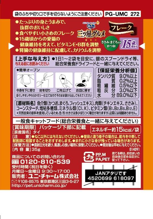 ・たっぷりの身とうまみで、抜群のおいしさを実現。・15歳頃からの愛猫の健康維持を考えて、ビタミンE・B群を調整。・腎臓の健康維持に配慮して、カリウムを調整。・食べやすい小さめのフレーク・ほぐしやすいやわらかゼリー仕立て