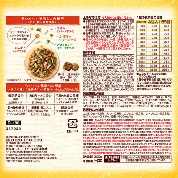 タンパク質 22.0%以上、脂質 9.0%以上、粗繊維 4.5%以下、粗灰分 8.5%以下、水分 10.0%以下