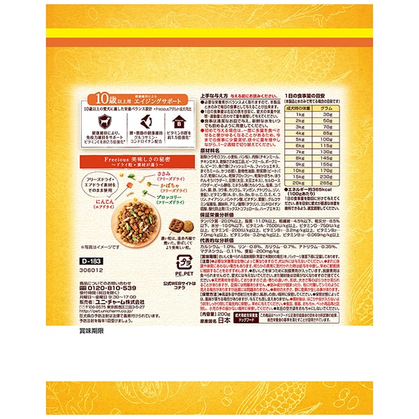 穀類(トウモロコシ、小麦粉、パン粉)、肉類(チキンミール、ポークミール、ビーフミール、チキンエキス、乾燥ささみ加工品、ビーフ)、魚介類(フィッシュミール、フィッシュエキス、まぐろミール、かつお節)、動物性油脂、豆類(大豆たんぱく、大豆、大豆エキス)、野菜類(ビートパルプ、乾燥にんじん、乾燥かぼちゃ、乾燥ブロッコリー、ほうれんそうパウダー)、チーズパウダー、セルロースパウダー、ビール酵母、ミネラル類(カルシウム、塩素、銅、鉄、ヨウ素、カリウム、ナトリウム、リン、セレン、亜鉛)、ビタミン類(A、B1、B2、B6、B12、D、E、K、コリン、パントテン酸、葉酸)、グルコサミン塩酸塩、調味料、コンドロイチン硫酸、酸化防止剤(ミックストコフェロール、ハーブエキス)