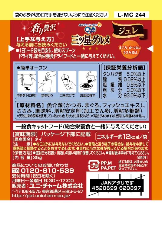 魚介類(かつお、まぐろ、フィッシュエキス)、ささみ、調味料、増粘安定剤(加工でん粉、増粘多糖類)