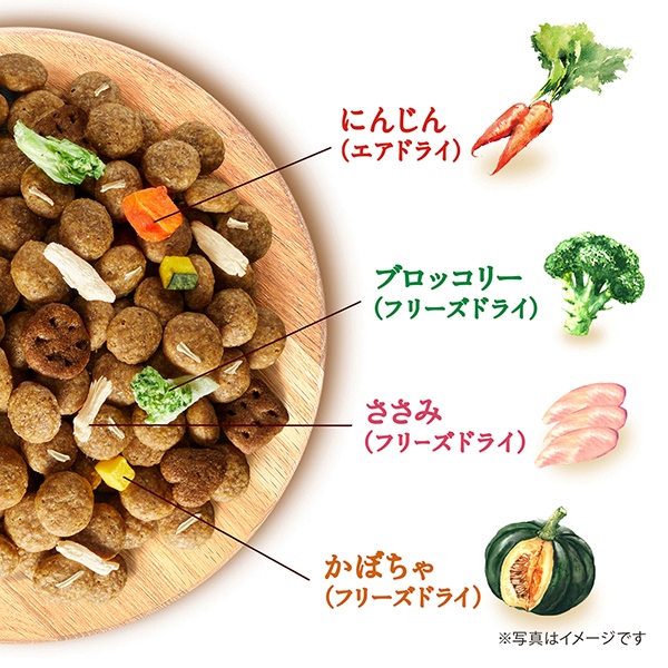 ドライ粒とフリーズドライ・エアドライの素材を、酸化を防ぐ鮮度維持包装。