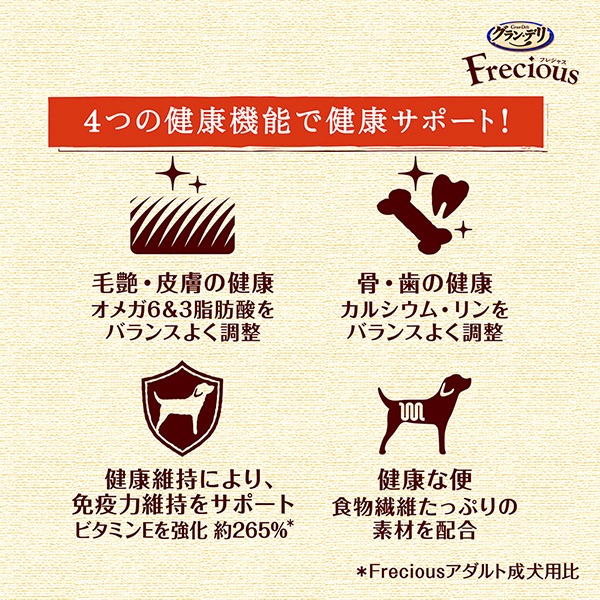 素材の旨みをぎゅっとフレッシュパックした国産プレミアムドッグフードです。 ドライ粒とフリーズドライ・エアドライの素材を、酸化を防ぐ鮮度維持包装。 いつでも美味しくワンちゃんが喜びます。 10歳以上の愛犬向けの栄養バランスで、愛犬が大好きなチキン&ビーフ入りです。