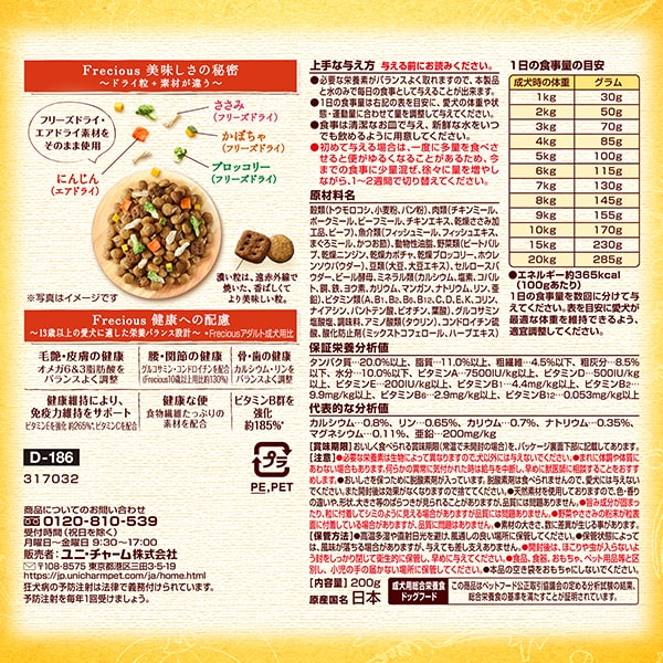 穀類(トウモロコシ、小麦粉、パン粉)、肉類(チキンミール、ポークミール、ビーフミール、チキンエキス、乾燥ささみ加工品、ビーフ)、魚介類(フィッシュミール、フィッシュエキス、まぐろミール、かつお節)、動物性油脂、豆類(大豆たんぱく、大豆、大豆エキス)、野菜類(ビートパルプ、乾燥にんじん、乾燥かぼちゃ、乾燥ブロッコリー、ほうれんそうパウダー)、チーズパウダー、セルロースパウダー、ビール酵母、ミネラル類(カルシウム、塩素、銅、鉄、ヨウ素、カリウム、ナトリウム、リン、セレン、亜鉛)、ビタミン類(A、B1、B2、B6、B12、C、D、E、K、コリン、パントテン酸、葉酸)、グルコサミン塩酸塩、調味料、コンドロイチン硫酸、酸化防止剤(ミックストコフェロール、ハーブエキス)