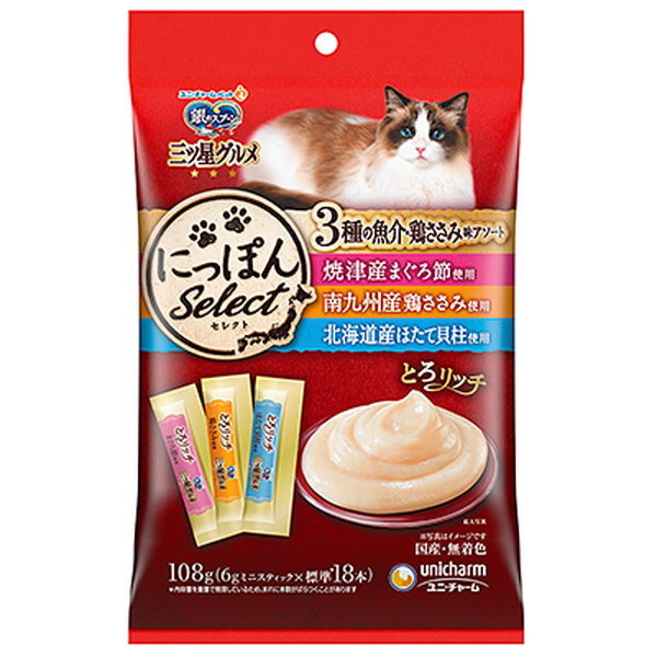【商品の特徴】・日本各地の「お取り寄せ」素材を使用した、とろ~りウェットタイプの上質なおやつ・6gで食べきりサイズ国産無着色・焼津産まぐろ節 &南九州産鶏ささみ&北海道産ほたて貝柱を使用