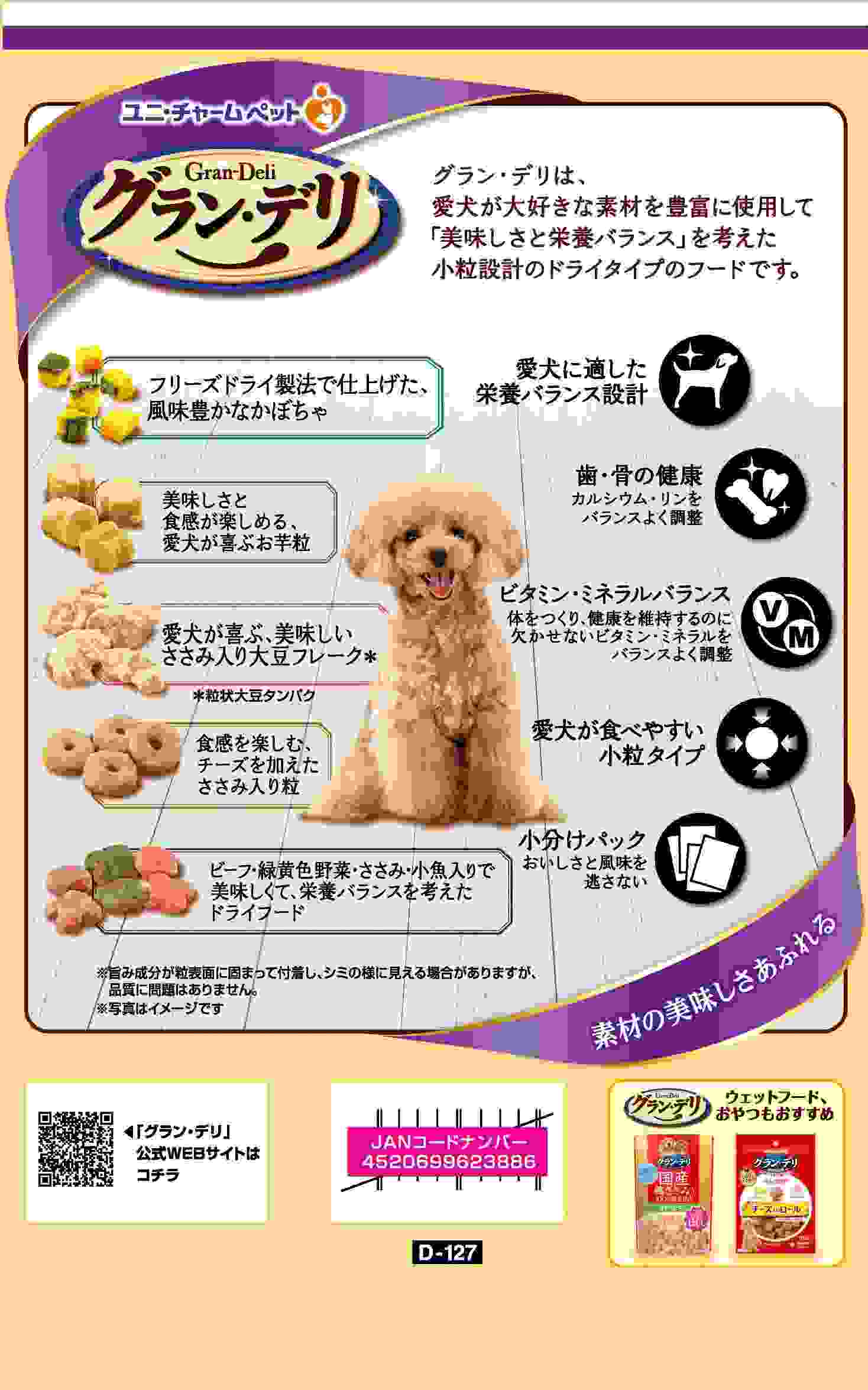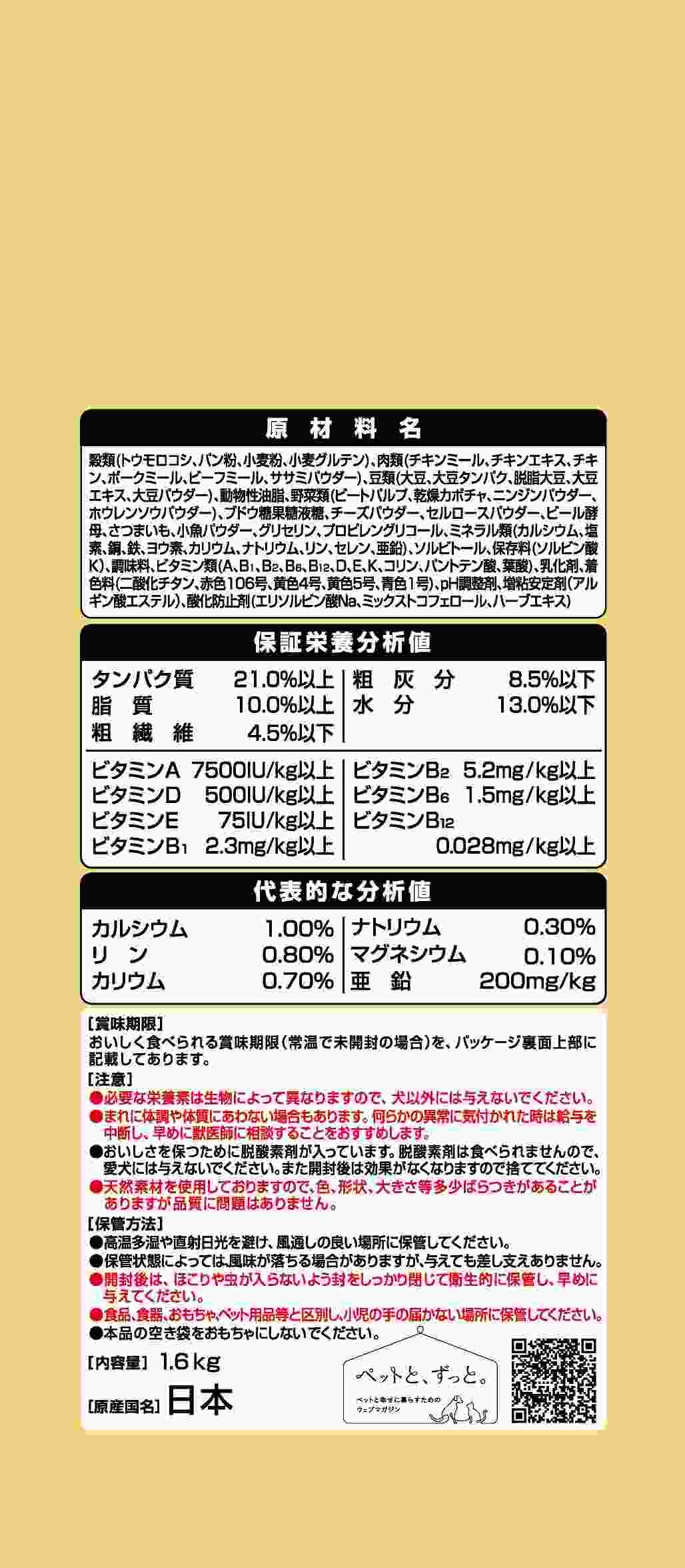 ・愛犬が大好きな素材を豊富に使用しました ・グルメなわんちゃんにぴったりな美味しいドライフード ・食感を楽しむ、チーズを加えたささみ入り粒たっぷり ・素材そのままの乾燥かぼちゃ入り ・さつまいもを使用したお芋粒入り ・ささみ入りの大豆フレーク入り ・成犬用総合栄養食
