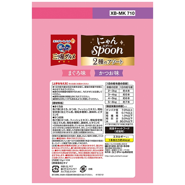 こぼれにくくておいしい、にゃんスプーン。 ネコちゃんが食べやすいスプーンタイプのウェットおやつ。 【使用上の注意】 ●必要な栄養素は生物によって異なりますので、猫以外には与えないでください。 ●1歳未満の幼猫には与えないでください。 ●まれに体調や体質に合わない場合もあります。何らかの異常に気付かれた時は給与を中断し、早めに獣医師に相談することをおすすめします。 ●開封時に中身が飛び散る場合がありますのでご注意ください。 ●まれに小さな骨が残っている場合があります。
