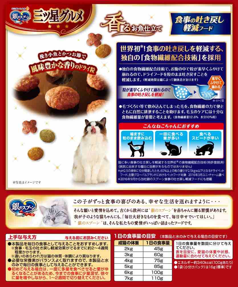 ・贅沢な素材の旨みたっぷりな、三ツ星のおいしさ ・独自の食物繊維配合技術で、お腹の中で粒がすばやくふやけて崩れるので、ドライフードを粒のまま吐き戻す事を軽減します ・毛づくろい等で飲み込んでしまった毛の排泄を助けるために、食物繊維を配合 ・猫の下部尿路の健康維持に配慮して、マグネシウム量を調整(含有量0.08%:標準値) ・おいしさと豊かな風味を逃さない、食べきり小分けパック16g(標準)×12袋