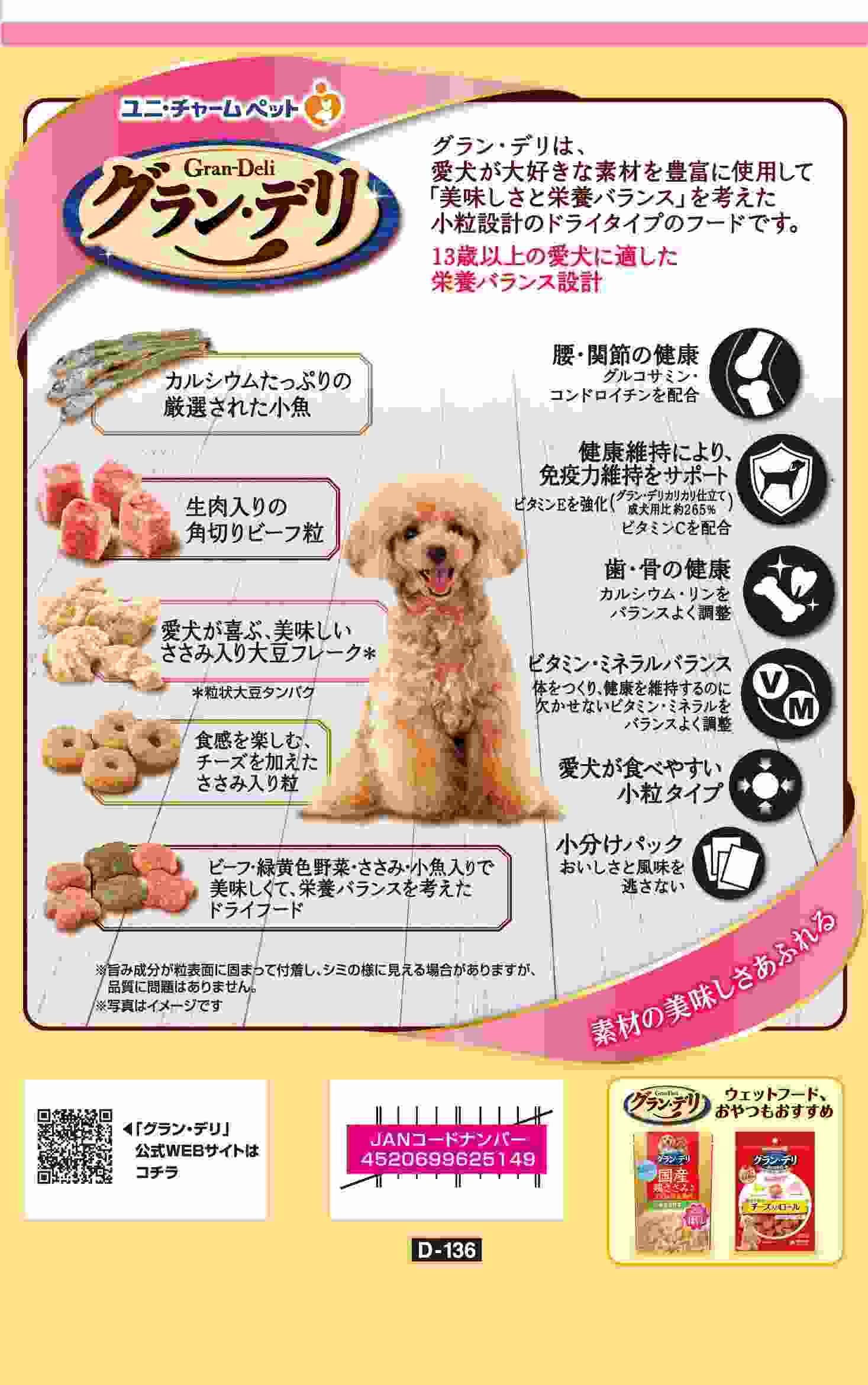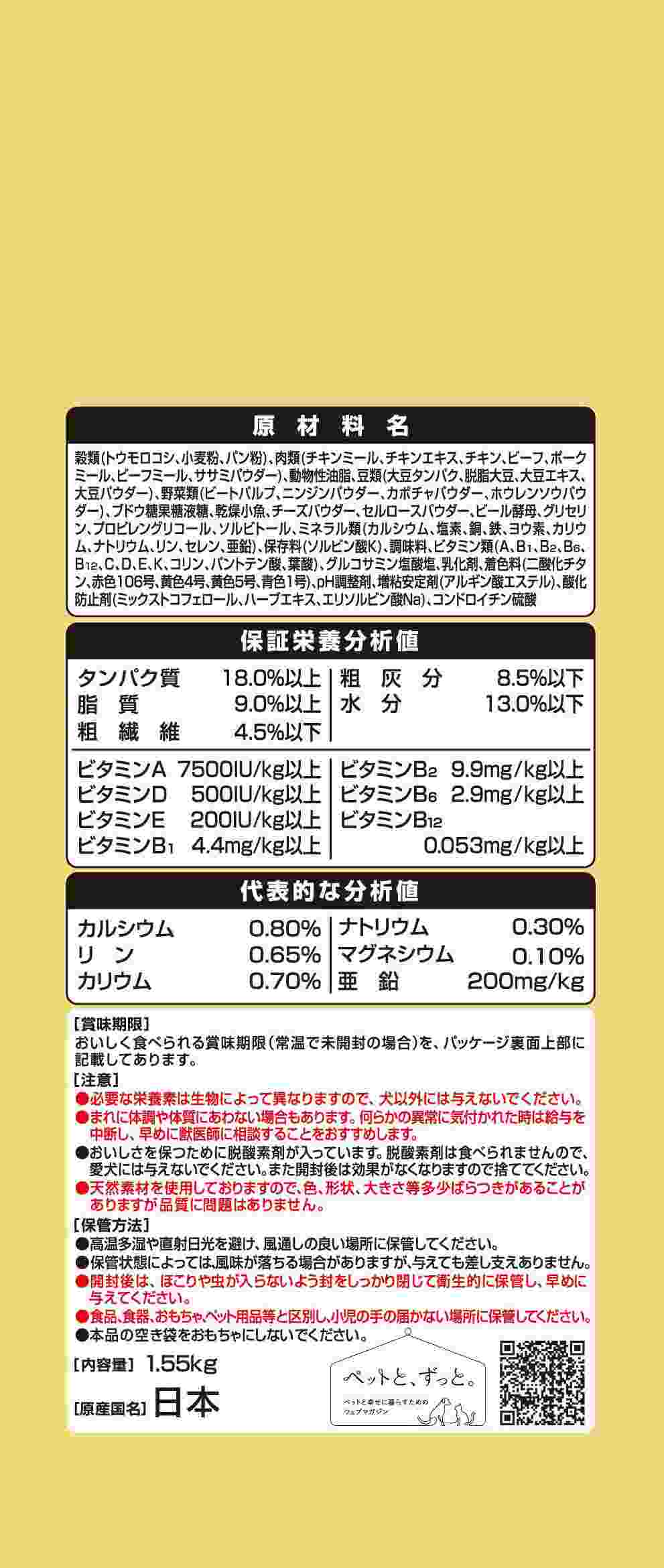 ・愛犬が大好きな素材を豊富に使用しました。 ・グルメなわんちゃんにぴったりな美味しいドライフード ・13歳以上の愛犬に適した栄養バランス設計 ・食感を楽しむ、チーズを加えたささみ入り粒たっぷり ・カルシウムたっぷりの厳選された国産小魚入り ・生肉入りの角切りビーフ粒入り ・ささみ入りの大豆フレーク入り ・総合栄養食