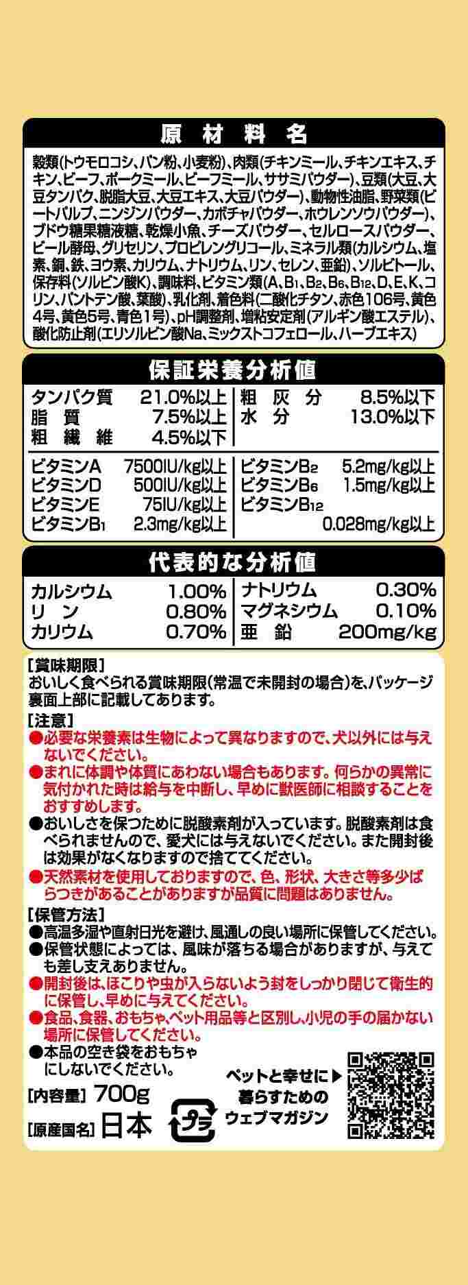 原材料穀類(トウモロコシ、パン粉、小麦粉)、肉類(チキンミール、チキンエキス、チキン、ビーフ、ポークミール、ビーフミール、ササミパウダー)、豆類(大豆、大豆タンパク、脱脂大豆、大豆エキス、大豆パウダー)、動物性油脂、野菜類(ビートパルプ、ニンジンパウダー、カボチャパウダー、ホウレンソウパウダー)、ブドウ糖果糖液糖、乾燥小魚、チーズパウダー、セルロースパウダー、ビール酵母、グリセリン、プロピレングリコール、ミネラル類(カルシウム、塩素、銅、鉄、ヨウ素、カリウム、ナトリウム、リン、セレン、亜鉛)、ソルビトール、保存料(ソルビン酸K)、調味料、ビタミン類(A、B1、B2、B6、B12、D、E、K、コリン、パントテン酸、葉酸)、乳化剤、着色料(二酸化チタン、赤色106号、黄色4号、黄色5号、青色1号)、pH調整剤、増粘安定剤(アルギン酸エステル)、酸化防止剤(エリソルビン酸Na、ミックストコフェロール、ハーブエキス)