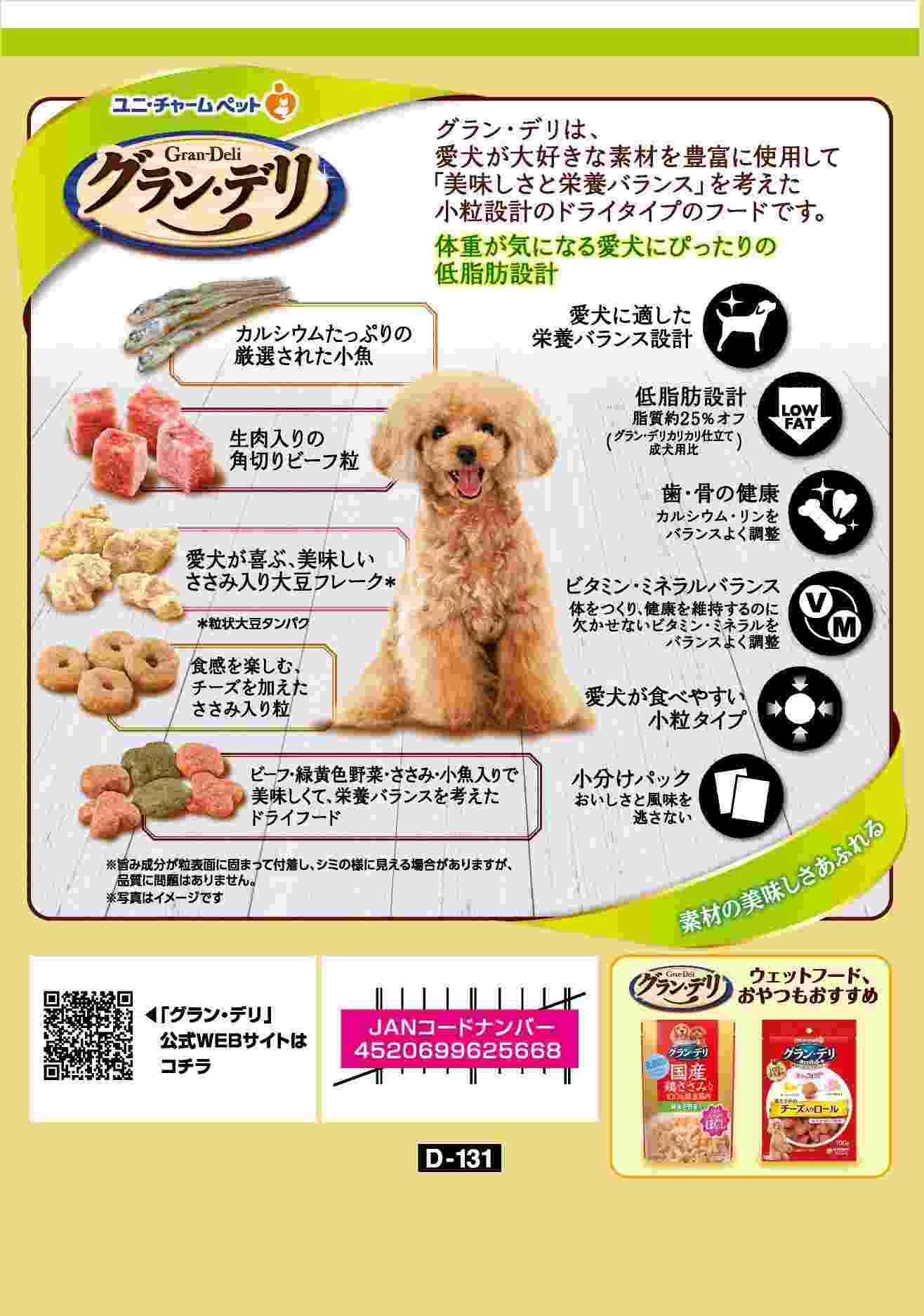 ・愛犬が大好きな素材を豊富に使用しました。 ・グルメなわんちゃんにぴったりな美味しいドライフード ・体重が気になる愛犬にぴったりの脂肪分約25%カット(グラン・デリカリカリ仕立て成犬用比) ・食感を楽しむ、チーズを加えたささみ入り粒たっぷり ・カルシウムたっぷりの厳選された国産小魚入り ・生肉入りの角切りビーフ粒入り ・ささみ入りの大豆フレーク入り ・成犬用総合栄養食