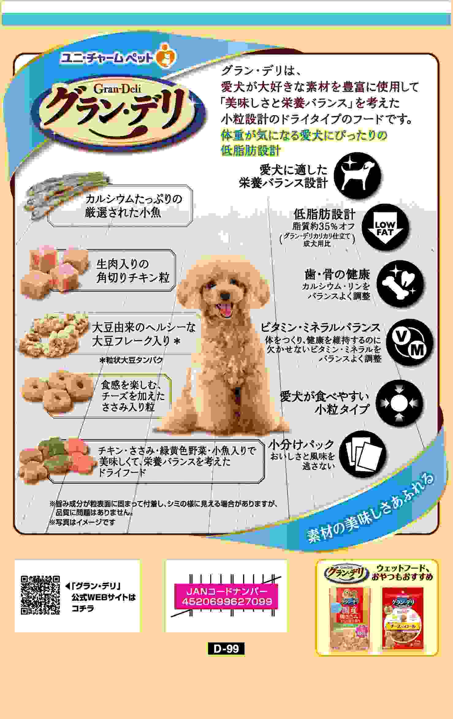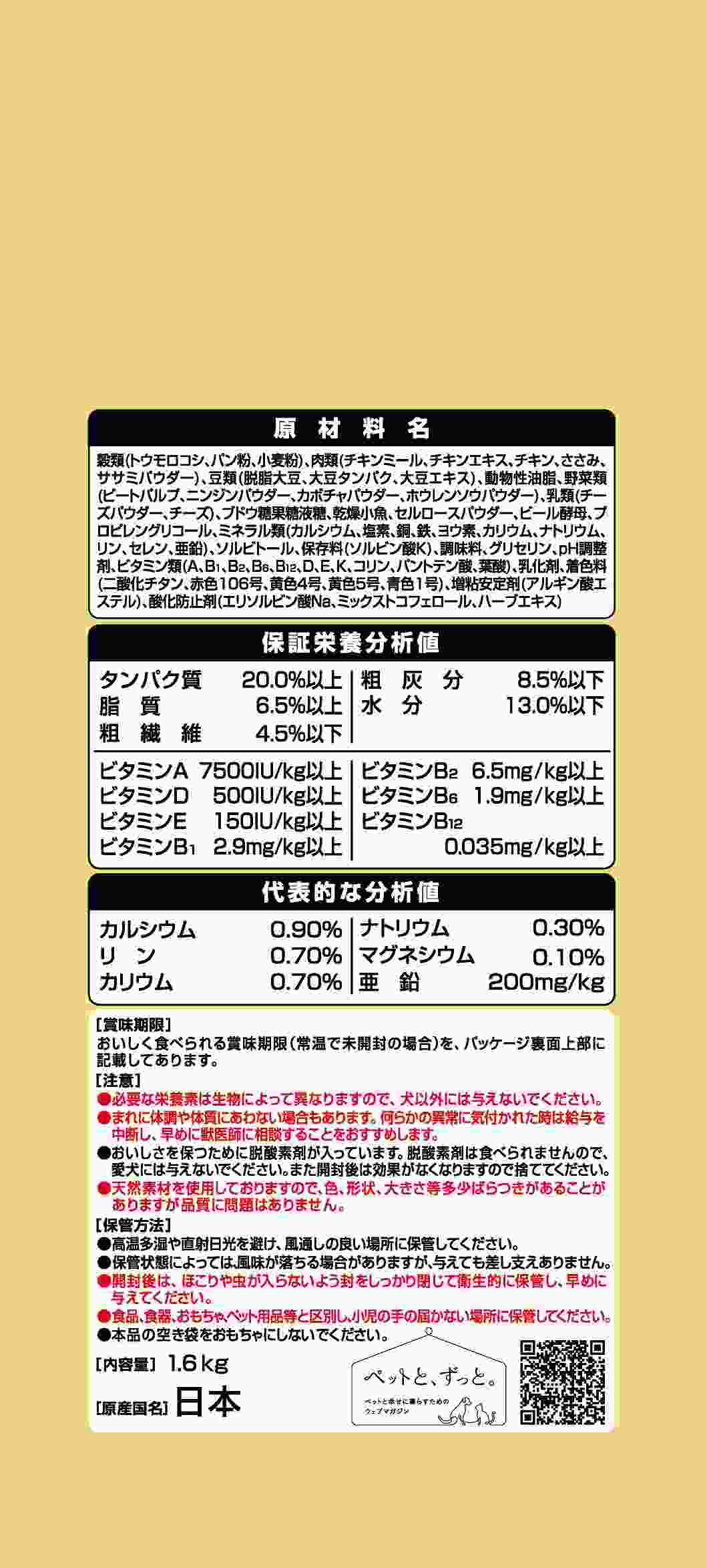 ・愛犬が大好きな素材を豊富に使用ました。・グルメなわんちゃんにぴったりな美味しいドライフード・体重が気になる愛犬にぴったりの低脂肪設計・食感を楽しむ、チーズを加えたささみ入り粒たっぷり・カルシウムたっぷりの厳選された国産小魚入り・生肉入りの角切りチキン粒入り・大豆由来のヘルシーな大豆フレーク入り・成犬用総合栄養食