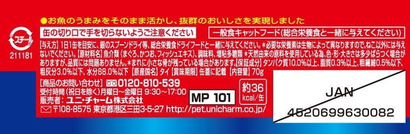 ●必要な栄養素は生物によって異なりますので、ねこ以外には与えないでください。●まれに体調や体質にあわない場合もあります。何らかの異常に気付かれた時は給与を中断し、早めに獣医師に相談することをおすすめします。●まれに小さな骨が残っている場合があります。