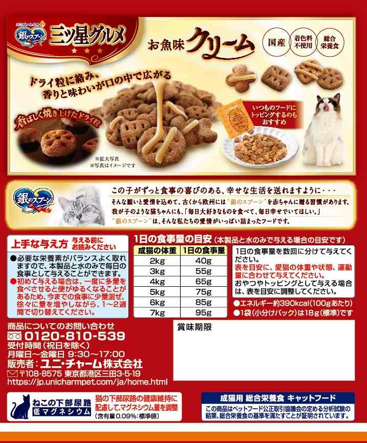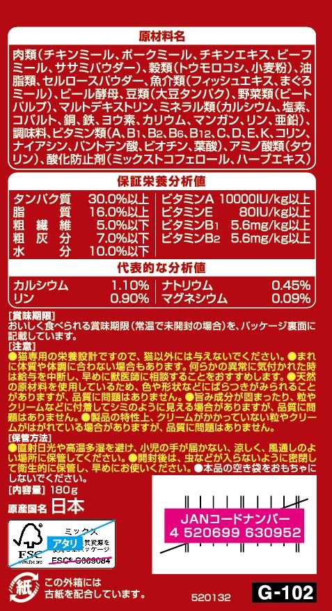 使用上の注意●猫専用の栄養設計ですので、猫以外には与えないでください。●まれに体質や体調に合わない場合もあります。何らかの異常に気付かれた時は給与を中断し、早めに獣医師に相談することをおすすめします。●天然の原材料を使用しているため、色や形状などにばらつきがみられることがありますが、品質に問題はありません。●旨み成分が固まったり、粒やクリームなどに付着してシミのように見える場合がありますが、品質に問題はありません。●製品の特性上、クリームがかかっていない粒やクリームがはがれている場合がありますが、品質に問題はありません。