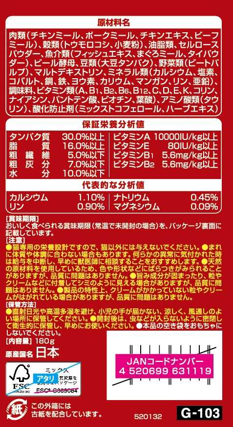 原材料肉類(チキンミール、ビーフミール、ポークミール、チキンエキス)、穀類(トウモロコシ、小麦粉)、油脂類、セルロースパウダー、魚介類(フィッシュエキス、まぐろミール、タイパウダー)、ビール酵母、豆類(大豆タンパク)、野菜類(ビートパルプ)、マルトデキストリン、ミネラル類(カルシウム、塩素、コバルト、銅、鉄、ヨウ素、カリウム、マンガン、リン、亜鉛)、調味料、ビタミン類(A、B1、B2、B6、B12、C、D、E、K、コリン、ナイアシン、パントテン酸、ビオチン、葉酸)、アミノ酸類(タウリン)、酸化防止剤(ミックストコフェロール、ハーブエキス)