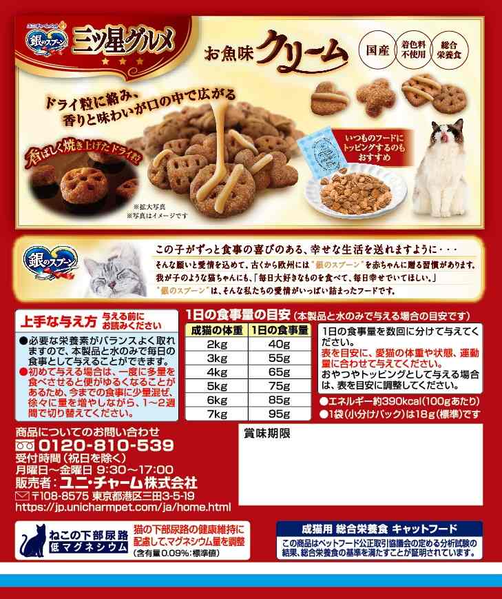 使用上の注意●猫専用の栄養設計ですので、猫以外には与えないでください。●まれに体質や体調に合わない場合もあります。何らかの異常に気付かれた時は給与を中断し、早めに獣医師に相談することをおすすめします。●天然の原材料を使用しているため、色や形状などにばらつきがみられることがありますが、品質に問題はありません。●旨み成分が固まったり、粒やクリームなどに付着してシミのように見える場合がありますが、品質に問題はありません。●製品の特性上、クリームがかかっていない粒やクリームがはがれている場合がありますが、品質に問題はありません。
