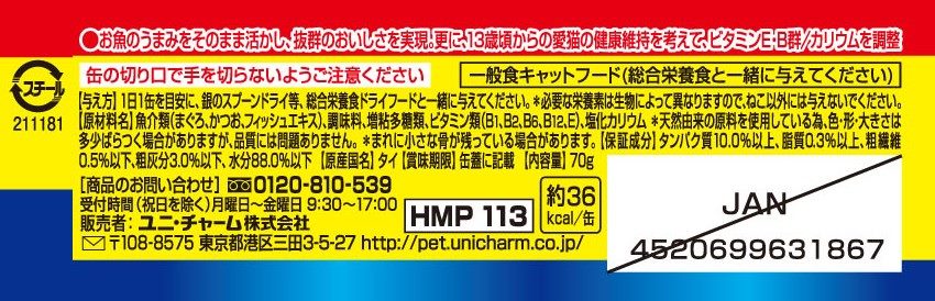 ・使いやすい便利なミニ缶サイズ(70g)・13歳頃からの愛猫の健康維持を考えて、ビタミンE・B群を調整・腎臓の健康維持に配慮して、カリウムを調整・まぐろ・発色剤不使用