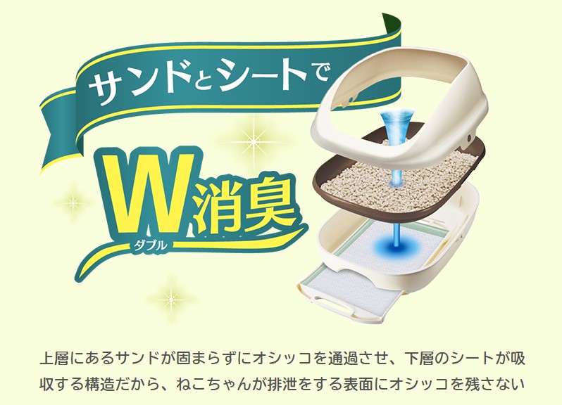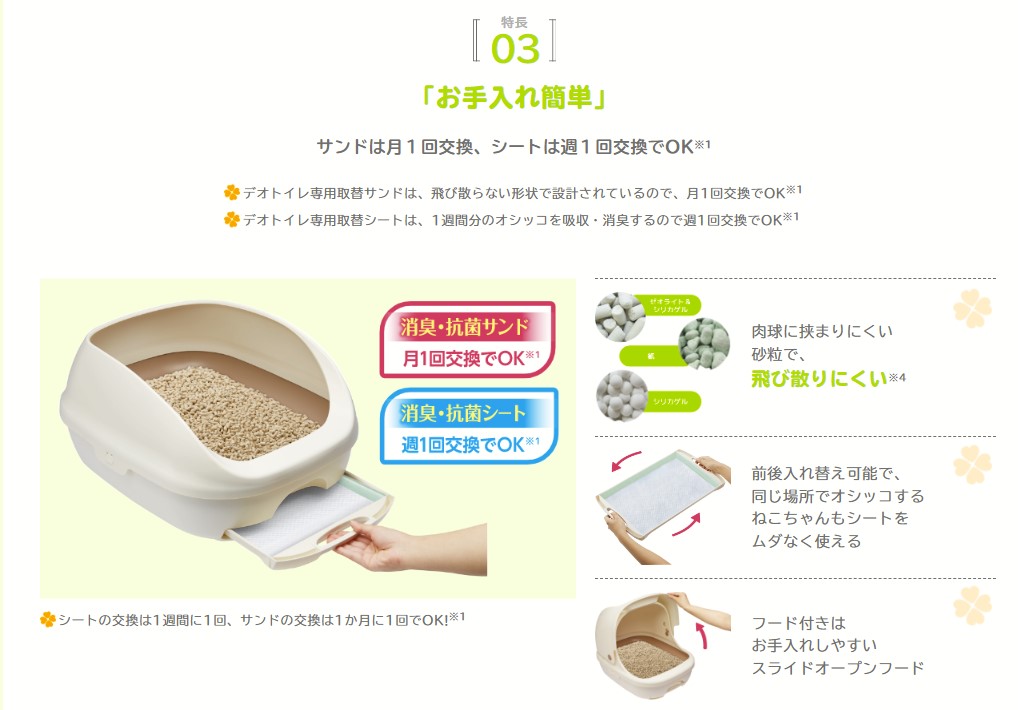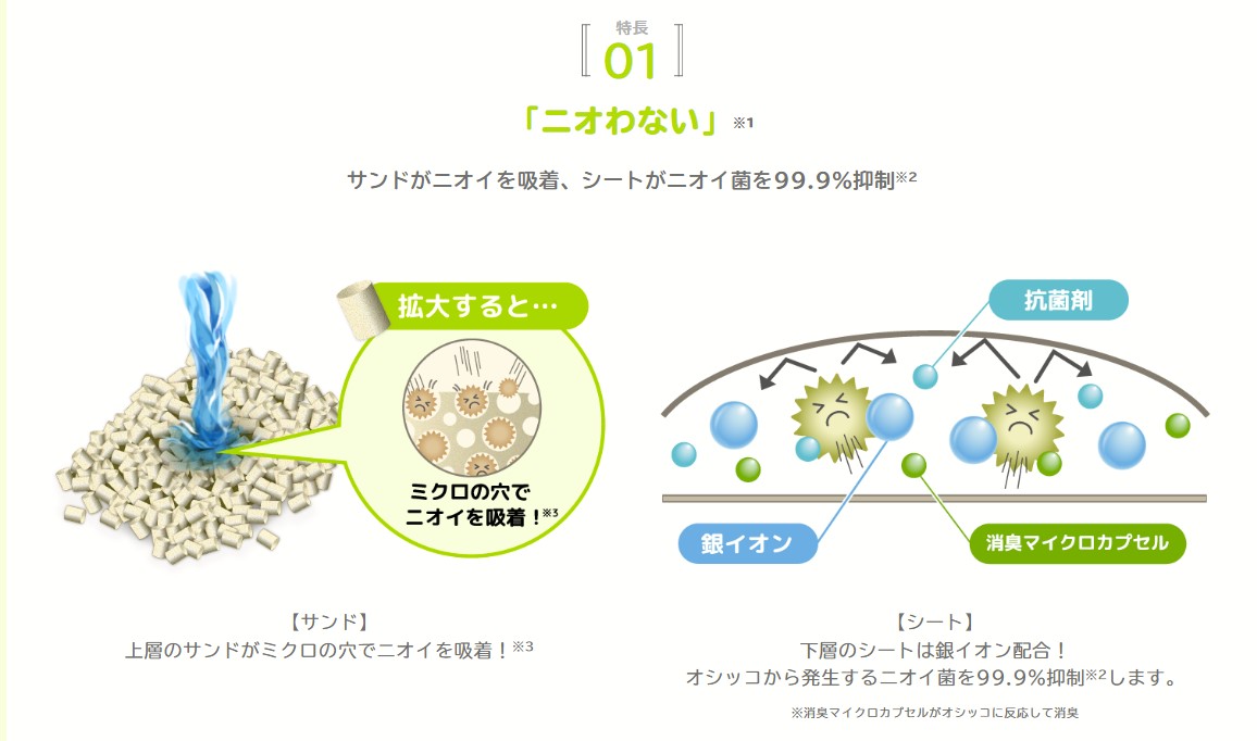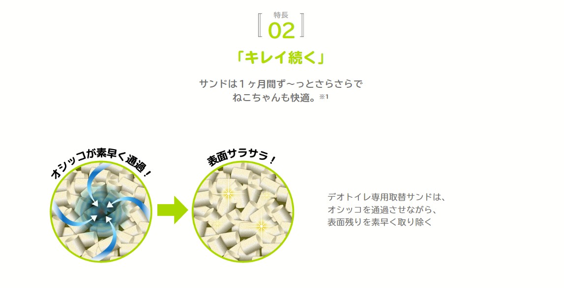 ※1 愛猫1頭(体重8kgまで)のデオトイレ使用時。ウンチをした場合は早めに取り除いてください。※2 第三者機関による消臭・抗菌サンド、消臭・抗菌シートの抗菌性試験結果。全ての菌を抑制するわけではありません。※3 「消臭・抗菌サンド」及び「消臭サンド」の機能となります。※4 デオトイレ取替専用消臭サンド(シリカゲル丸粒タイプ)比。