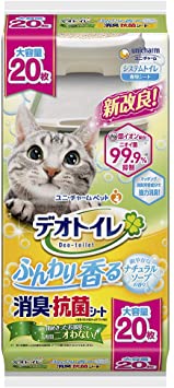 ・1週間分の尿をしっかり吸収し、抗菌剤がニオイを強力に抑えます。 ※愛猫1頭(体重8kgまで)の場合。ウンチをした場合は早く取り除いてください。・銀イオン配合。ニオイ菌99.9%抑制 ※第三者機関による消臭・抗菌シートの抗菌性試験結果。すべての菌を抑制するわけではありません。・マッチング消臭芳香成分で強力消臭・シート表面が白いので、オシッコの色がわかりやすく、チェックしやすい。・シート交換時やオシッコチェックの時も、ふんわり香り、心地よくさわやかな気分になれます。<原材料>ポリオレフィン・ポリエステル不織布、綿状パルプ、吸水紙、高分子吸水材、ポリエチレンフィルム、抗菌剤、ホットメルト接着剤、香料<内容量> 20枚<香り> ナチュラルソープ≪使用方法≫デオトイレ又はその他のシステムトイレと一緒にお使いください。単品では使用しないでください。また、デオトイレをご使用の場合は必ずデオトイレ専用の消臭・抗菌シートもあわせてご使用下さい。