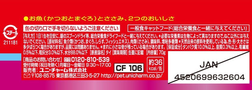 ・使いやすい便利なミニ缶サイズ(70g)・お魚(かつおとまぐろ)とささみの2つのおいしさ・うれしいしらす入り・発色剤不使用