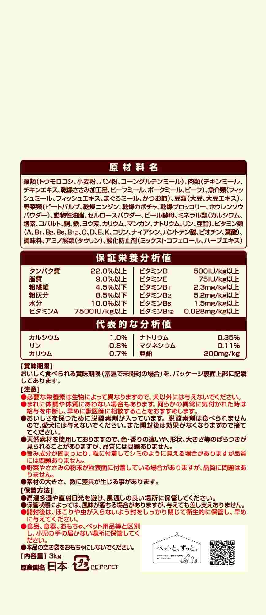 素材を美味しくフレッシュパックした国産プレミアムドッグフードです。遠赤外線で焼き上げた粒とフリーズドライ・エアドライの素材を、酸化を防ぐ鮮度維持包装をすることで、いつでも美味しくワンちゃんが喜びます。体重が気になる愛犬向けの低脂肪設計で、愛犬が大好きなチキン&ビーフ入りです。