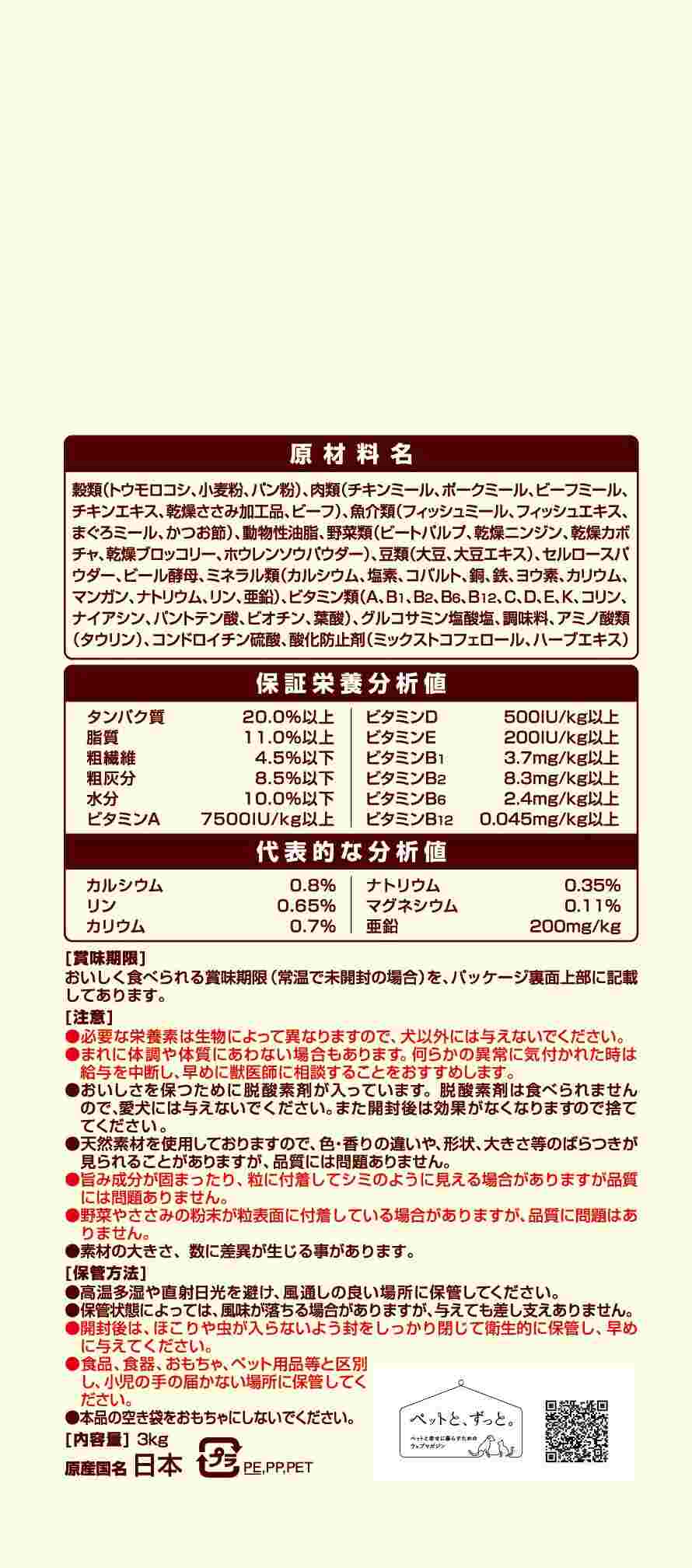 素材を美味しくフレッシュパックした国産プレミアムドッグフードです。遠赤外線で焼き上げた粒とフリーズドライ・エアドライの素材を、酸化を防ぐ鮮度維持包装をすることで、いつでも美味しくワンちゃんが喜びます。10歳以上向けの栄養バランスで、愛犬が大好きなチキン&ビーフ入りです。