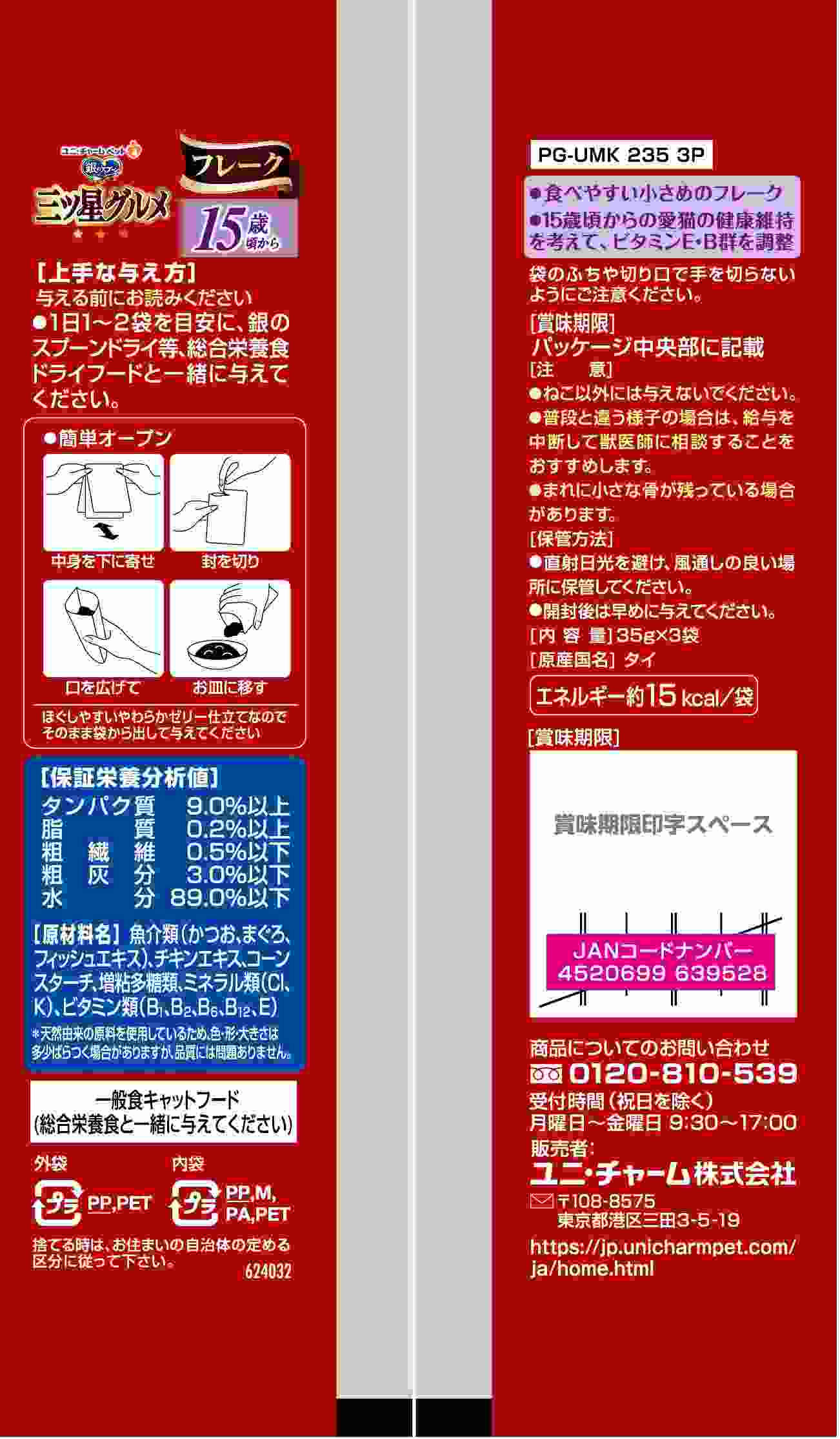 ・たっぷりの身とうまみで、抜群のおいしさを実現 ・15歳頃からの愛猫の健康維持を考えて、ビタミンE・B群を調整 ・食べやすい小さめのフレーク・ほぐしやすいやわらかゼリー仕立て ・3袋入り