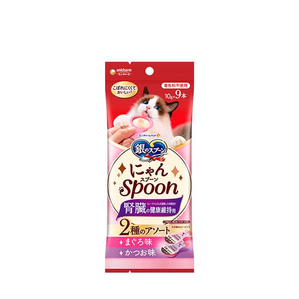 こぼれにくくて、ねこちゃんが食べやすいスプーンタイプ。 お魚をすりつぶした、とろ~りウェットタイプのおやつ。 10gで食べきりサイズ。 着色料不使用。 ひと袋に2種類の味が詰まったアソートタイプ。 腎臓の健康維持に配慮した栄養設計。