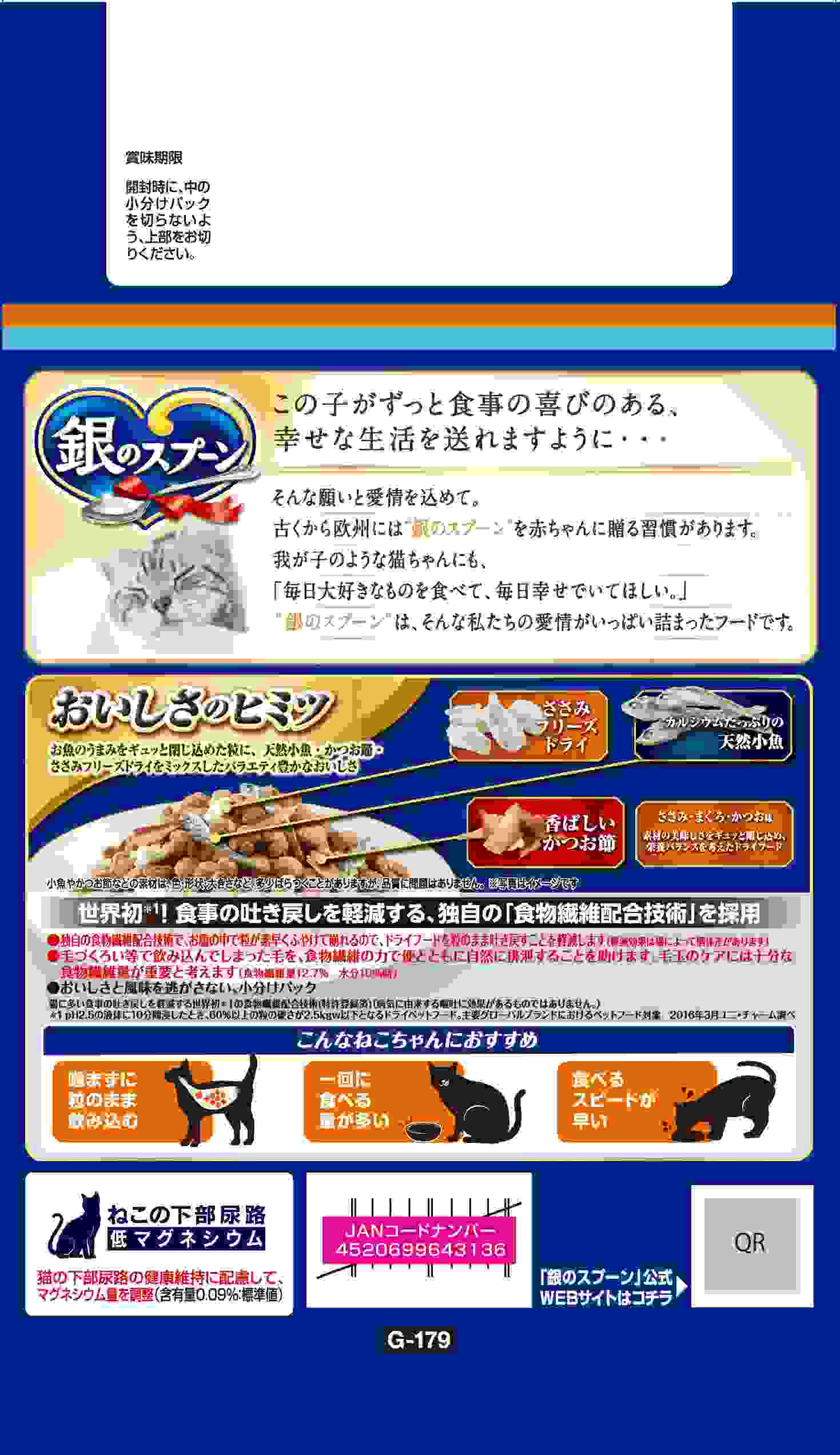 ・お魚のうまみをたっぷり閉じ込めた粒に、天然小魚やかつお節、ささみフリーズドライをミックスしたバラエティ豊かなおいしさ ・独自の食物繊維配合技術で、お腹の中で粒がすばやくふやけて崩れるので、ドライフードを粒のまま吐き戻すことを軽減します ・毛づくろい等で飲み込んでしまった毛の排泄を助けるために、食物繊維を配合 ・噛まずに粒のまま飲み込んだり、1回に食べる量が多い猫ちゃんにおすすめ