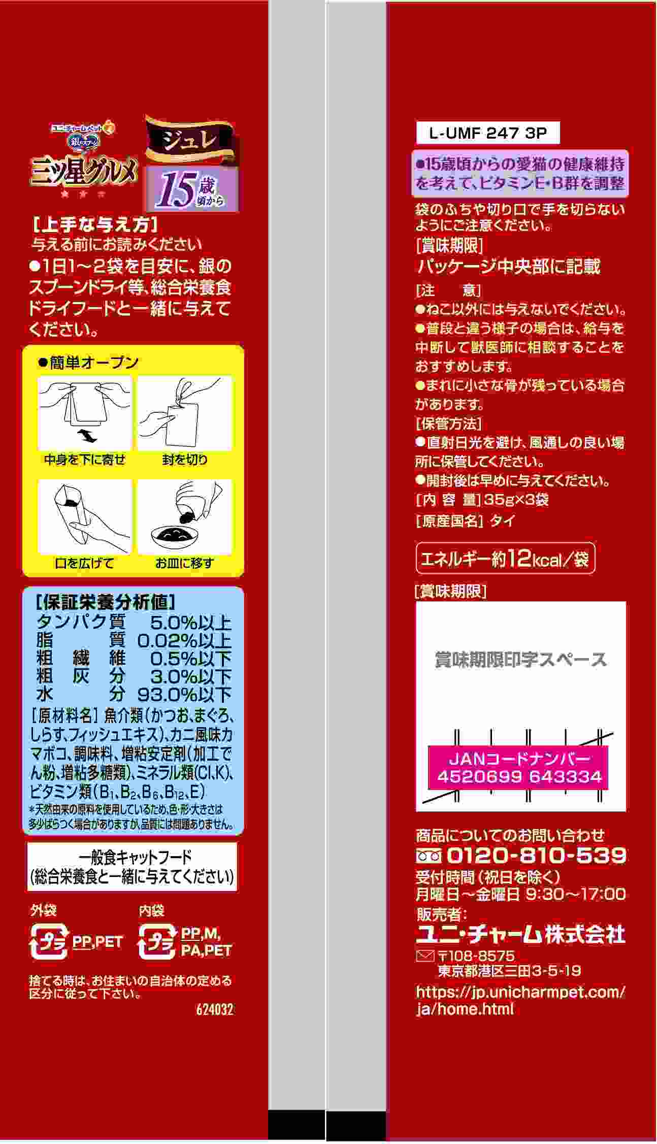・具と一緒に味わう贅沢な美味しさ ・お魚のうまみがたっぷりなとろけるジュレが、お魚の身とからんで一緒に食べやすく、贅沢なおいしさを実現。 ・15歳頃からの愛猫の健康維持を考えて、ビタミンE・B群を調整 ・3袋入り